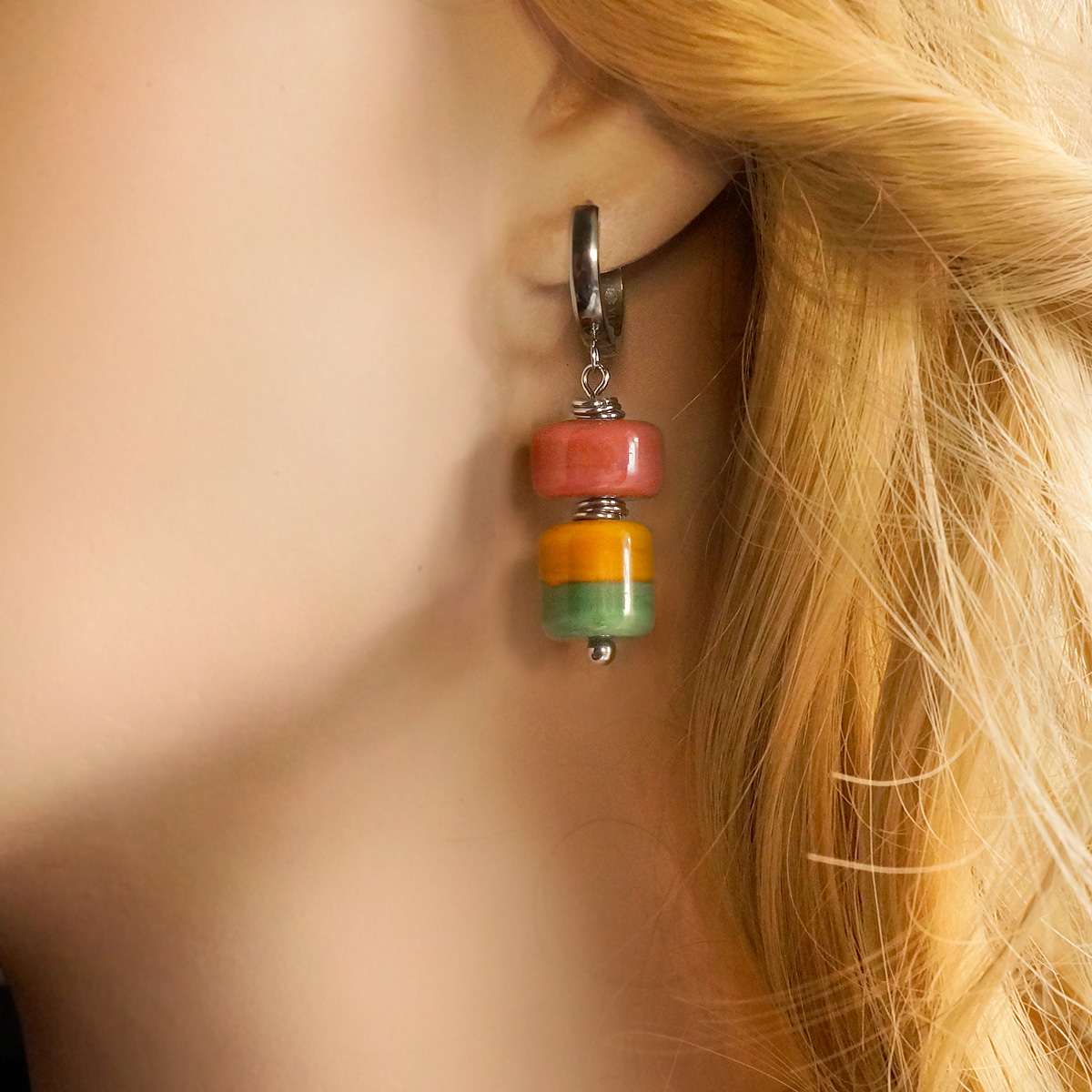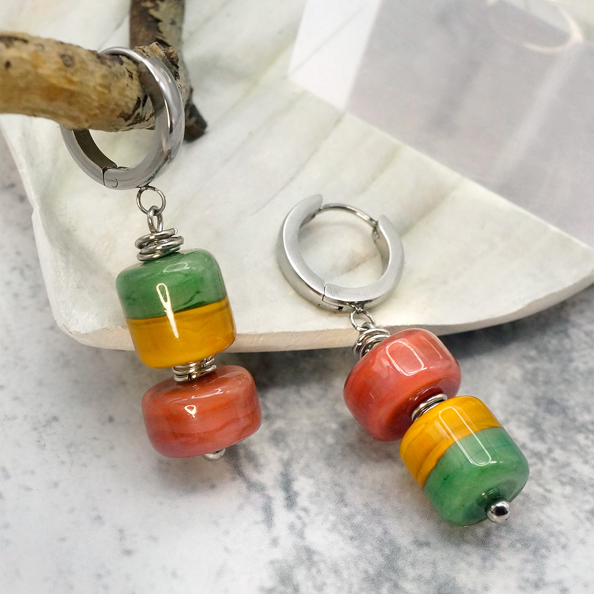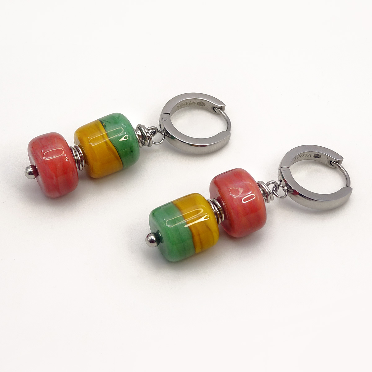 Серьги изготовлены из муранского стекла и гипоаллергенной ювелирной стали, что очень важно для людей с чувствительной кожей. Металл не темнеет и не подвергается воздействиям окружающей среды, надолго обеспечивая красивый внешний вид изделия. Размер стеклянных бусин - 0,7*1,3 и 1,2*1,2 см. Длина серег - 4 см. Вес обеих серег - 16 г