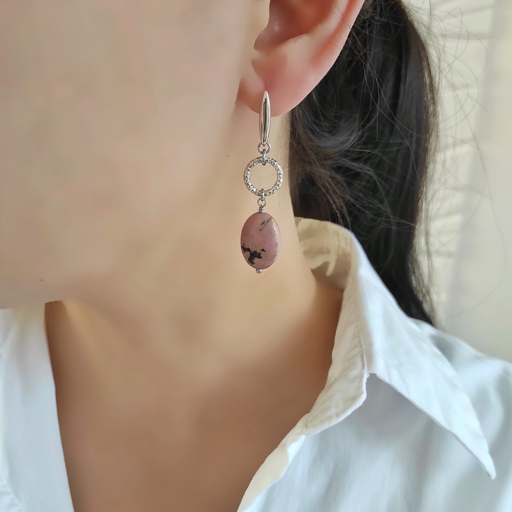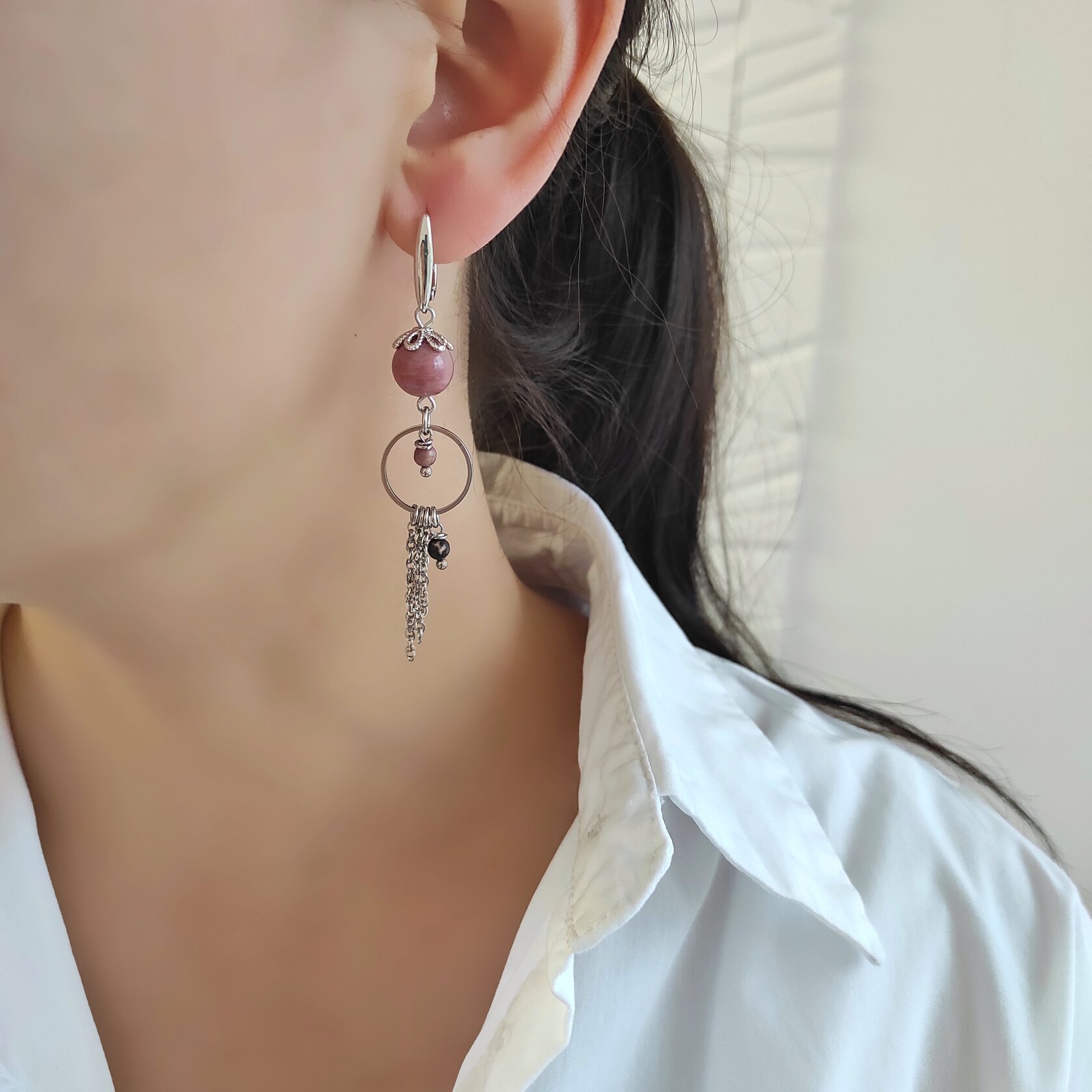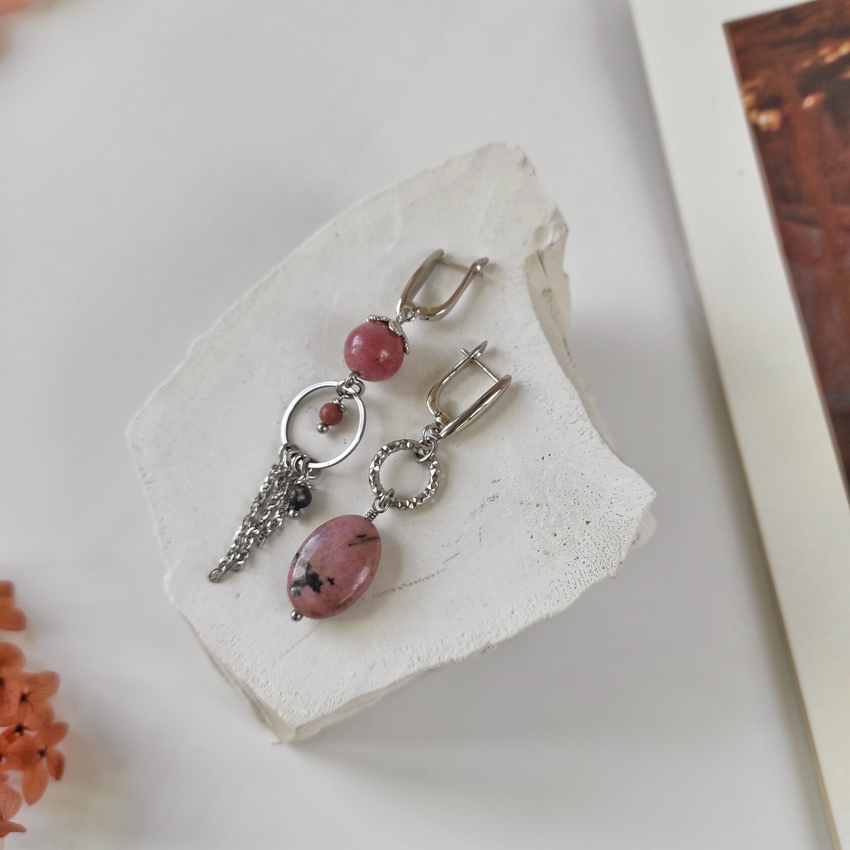 Серьги из натурального родонита, асимметричная пара.