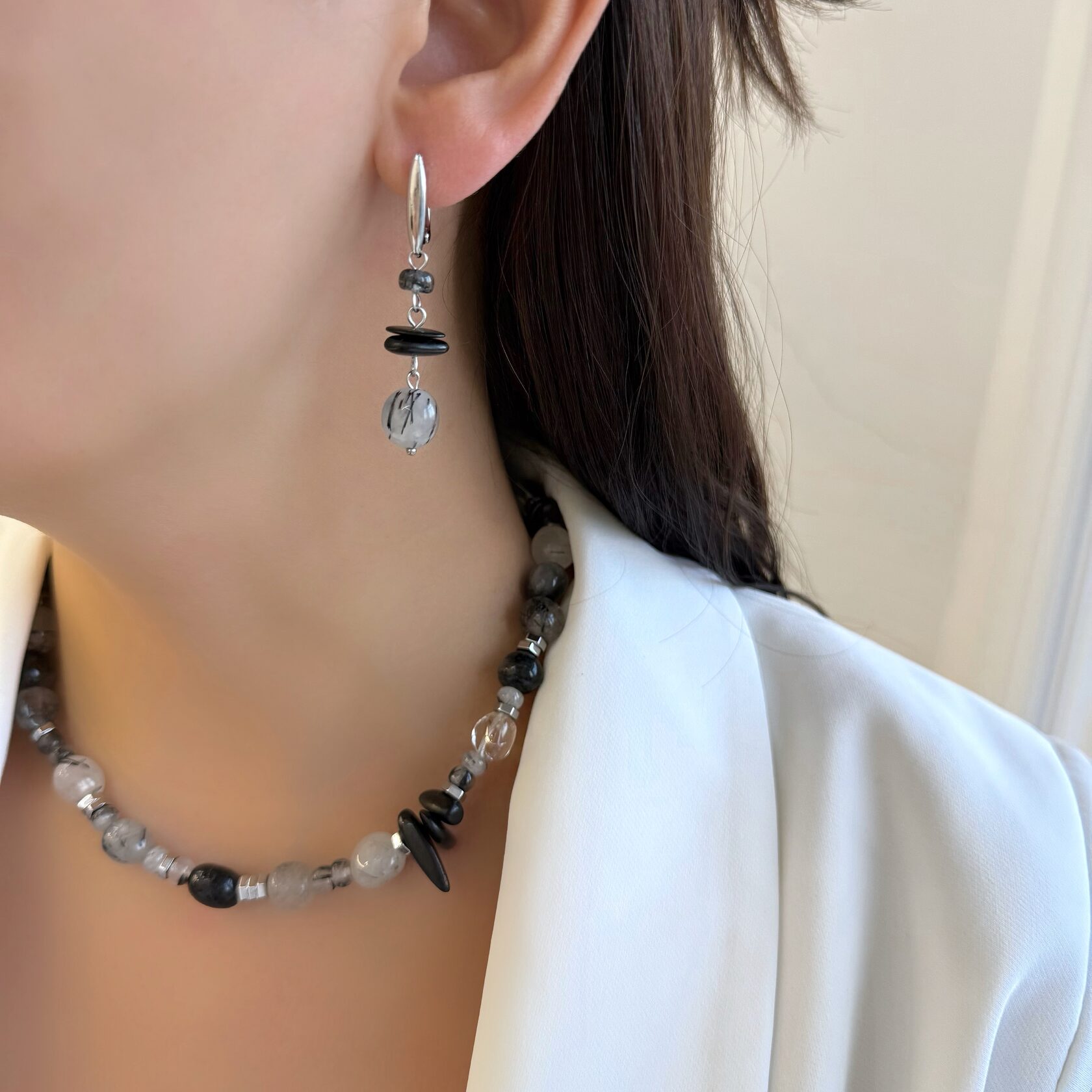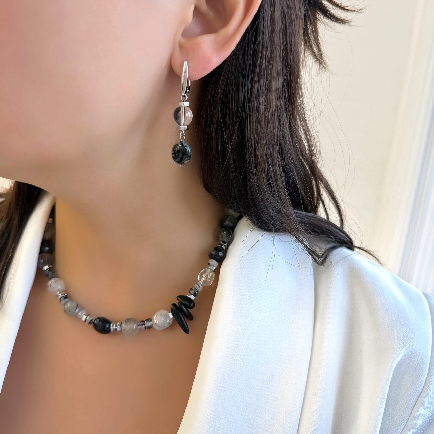 Серьги из турмалинового кварца, горного хрусталя и гиперстена