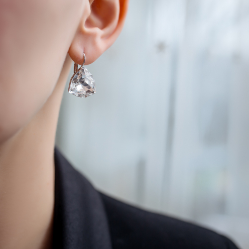 Серьги с прозрачным кристаллом в лаконичной подвесной форме для светлых, собранных образов.