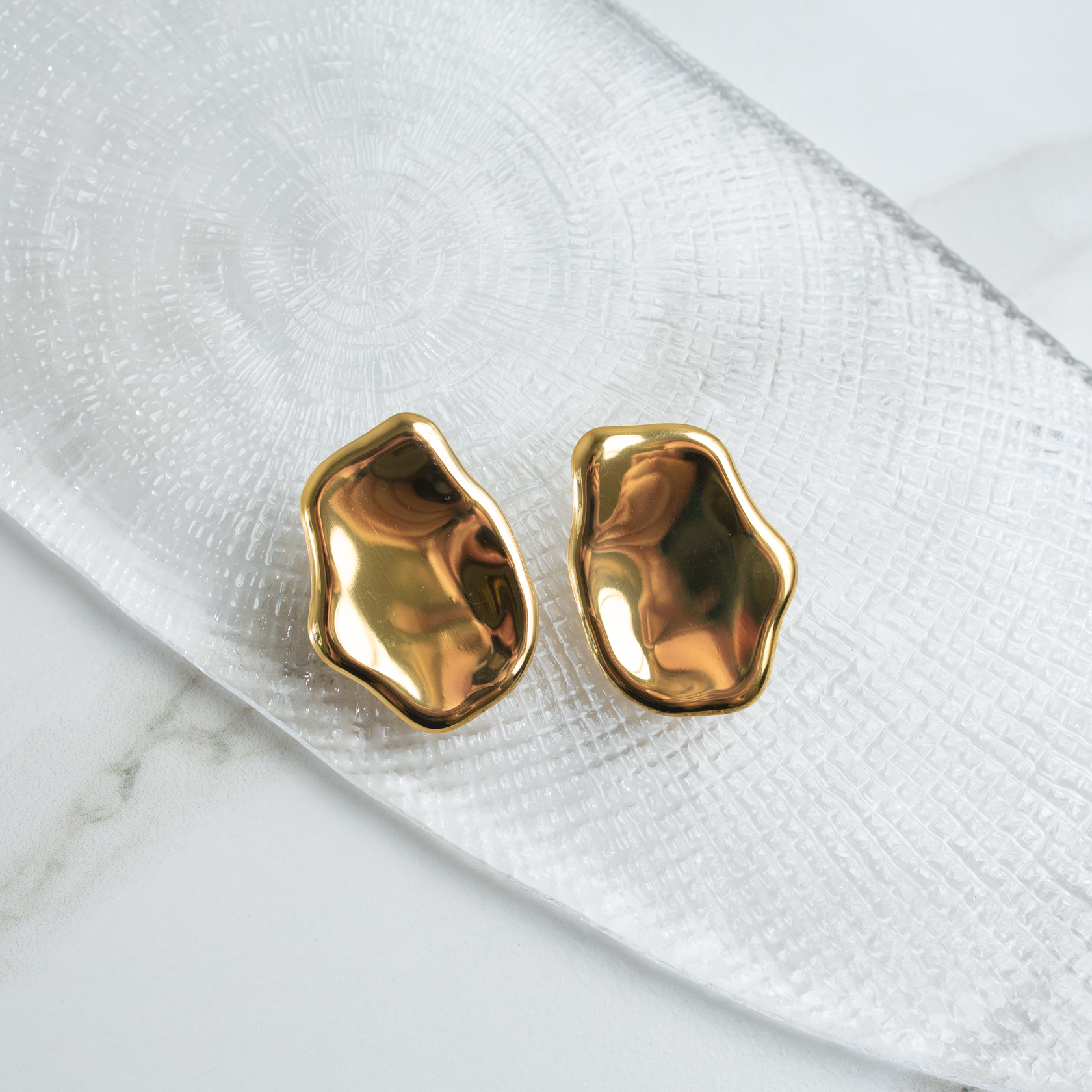 Серьги Mola G выполнены в цельной, слегка неровной форме без острых линий и декоративных разрывов. Зеркальная поверхность отражает свет мягко, создавая ощущение тёплого металла и спокойного блеска. Форма визуально округляет образ и не спорит с одеждой, оставаясь самостоятельным элементом.