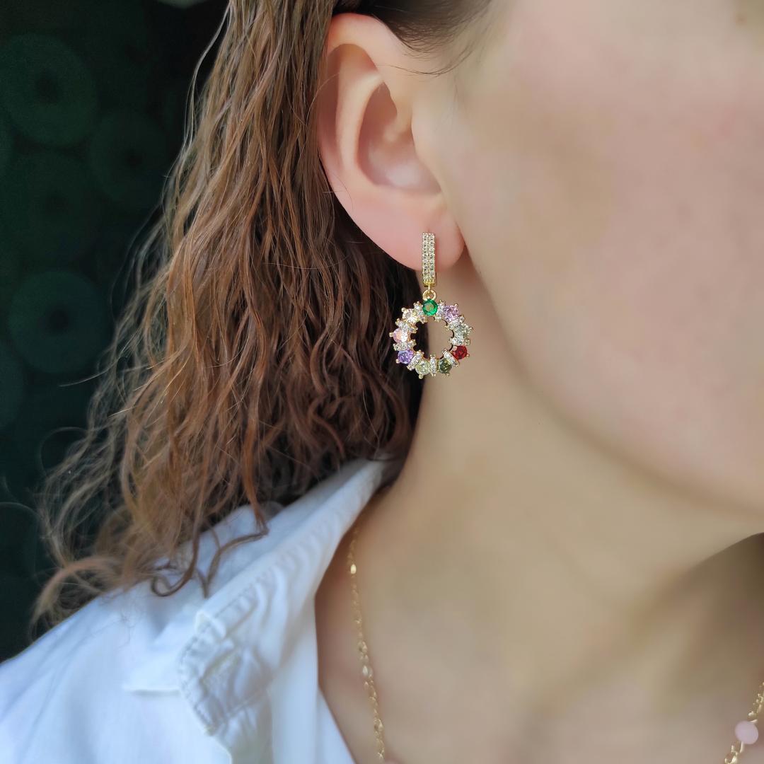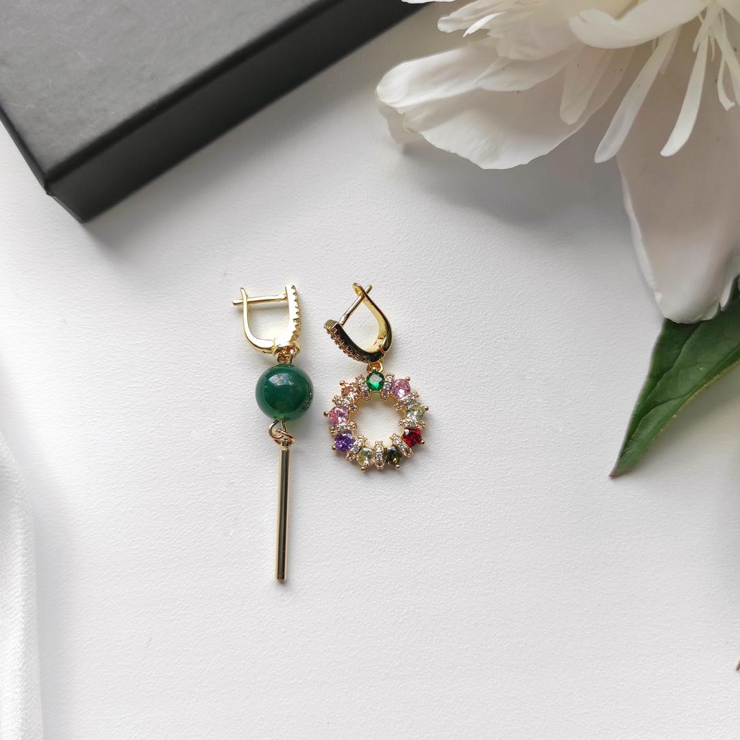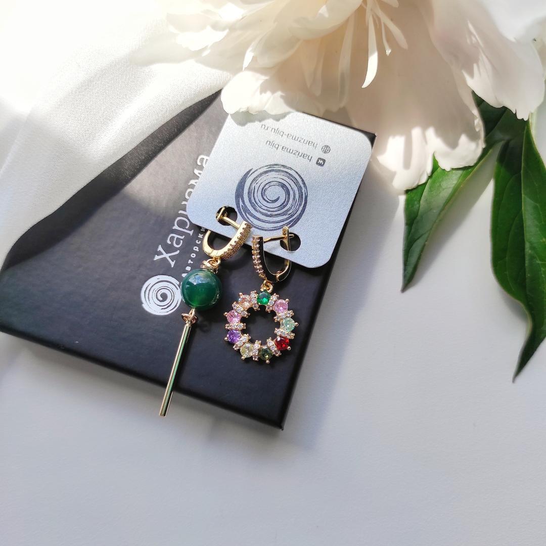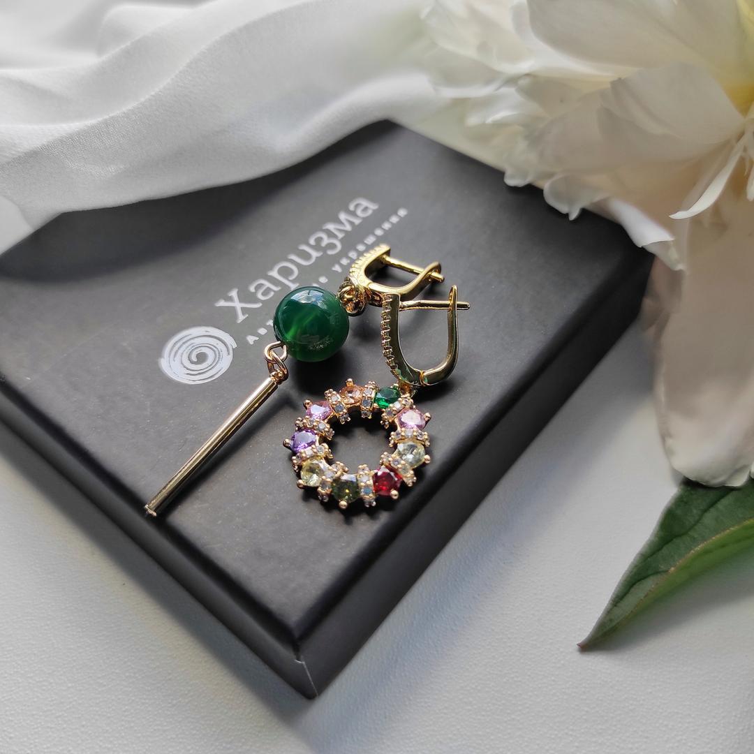 Красивая асимметричная пара. Серьга с цветными цирконами: диаметр 17мм.