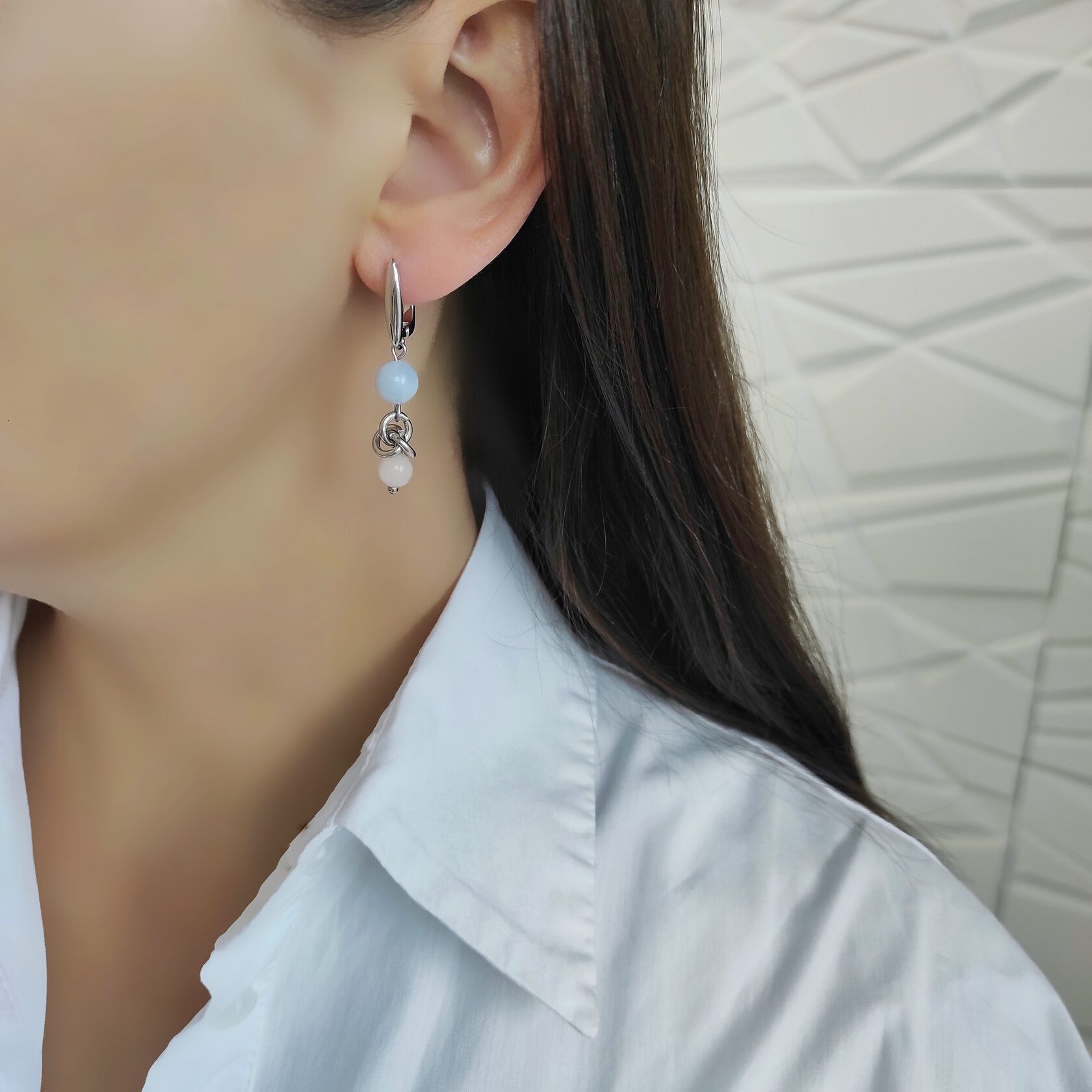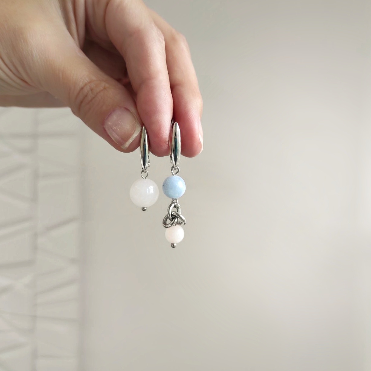 Асимметричные серьги из кварца пастельных оттенков: голубой, розовый. Камни диаметром 10мм, 8мм, 6мм