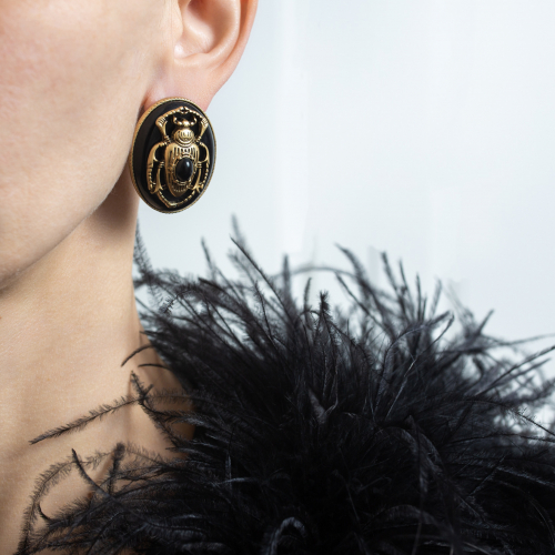 Акцентное украшение с выразительным декоративным элементом в виде жука. Контраст чёрного фона и золотистого рельефа создаёт насыщенный, драматичный образ.