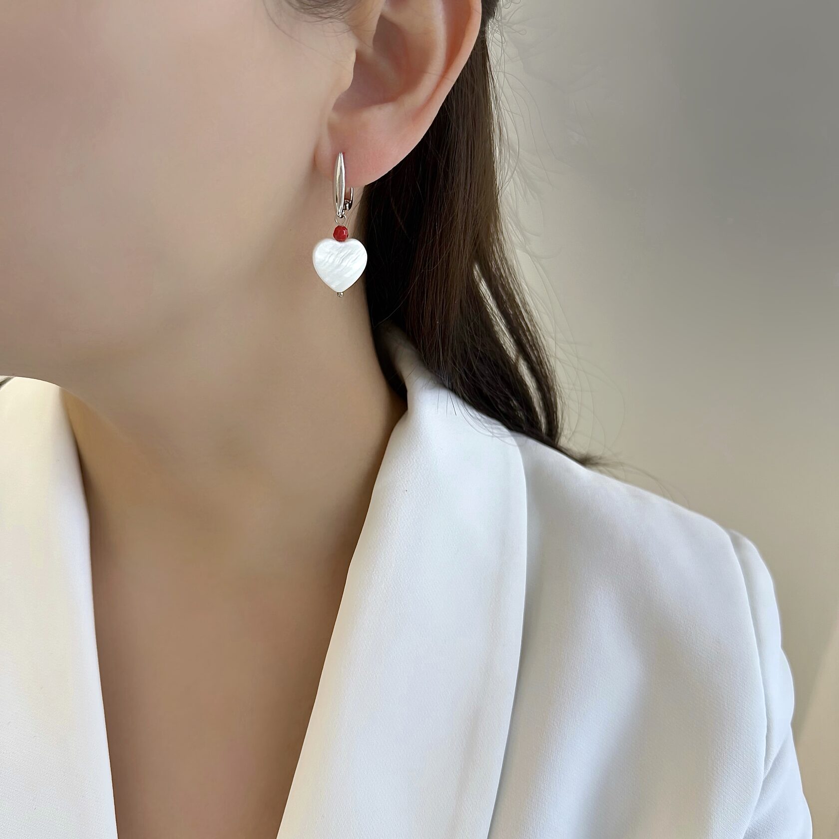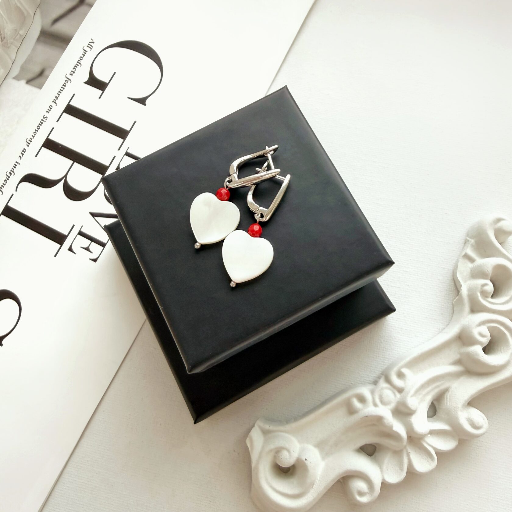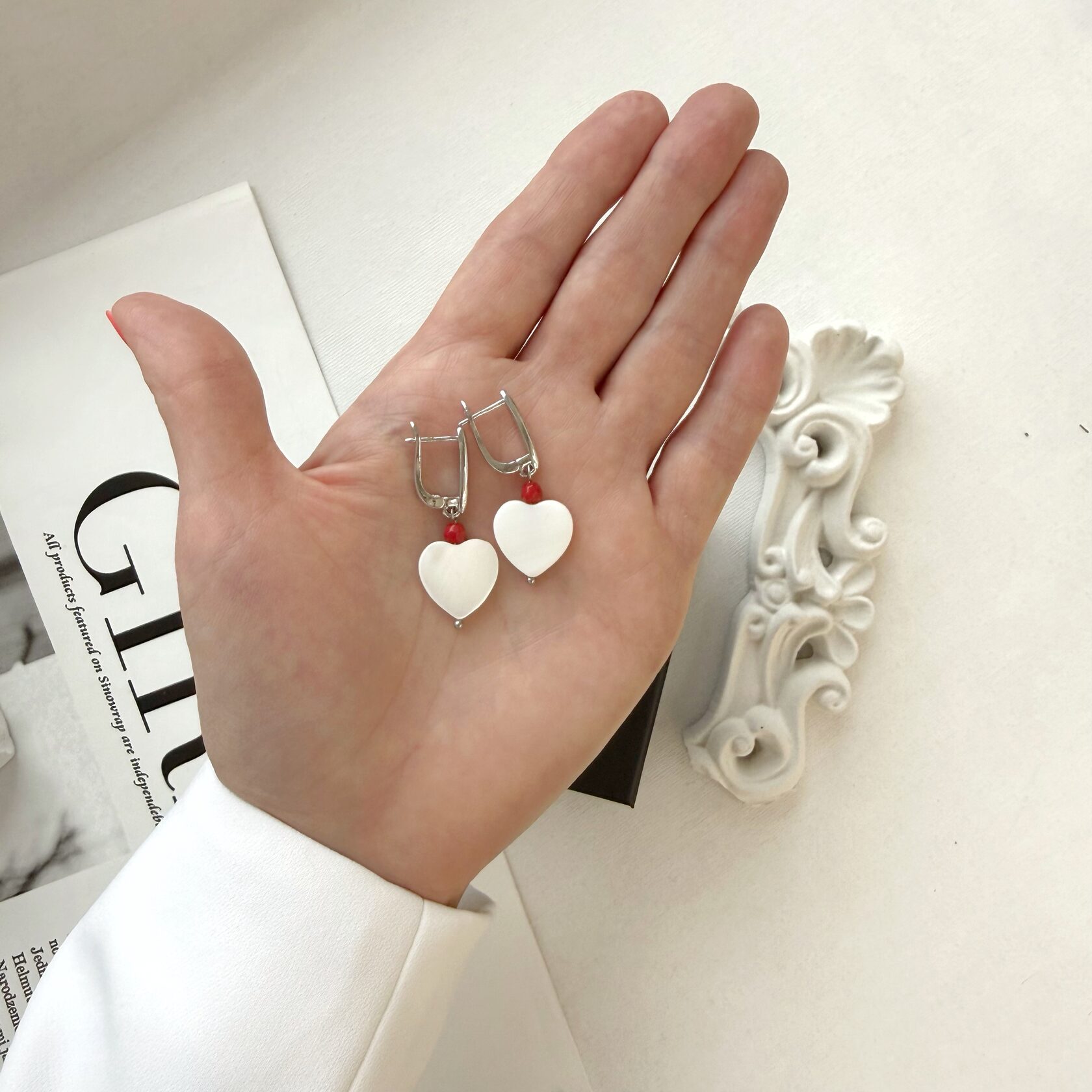 Красивые сердечки из натурального перламутра. Красный камень - красный коралл.