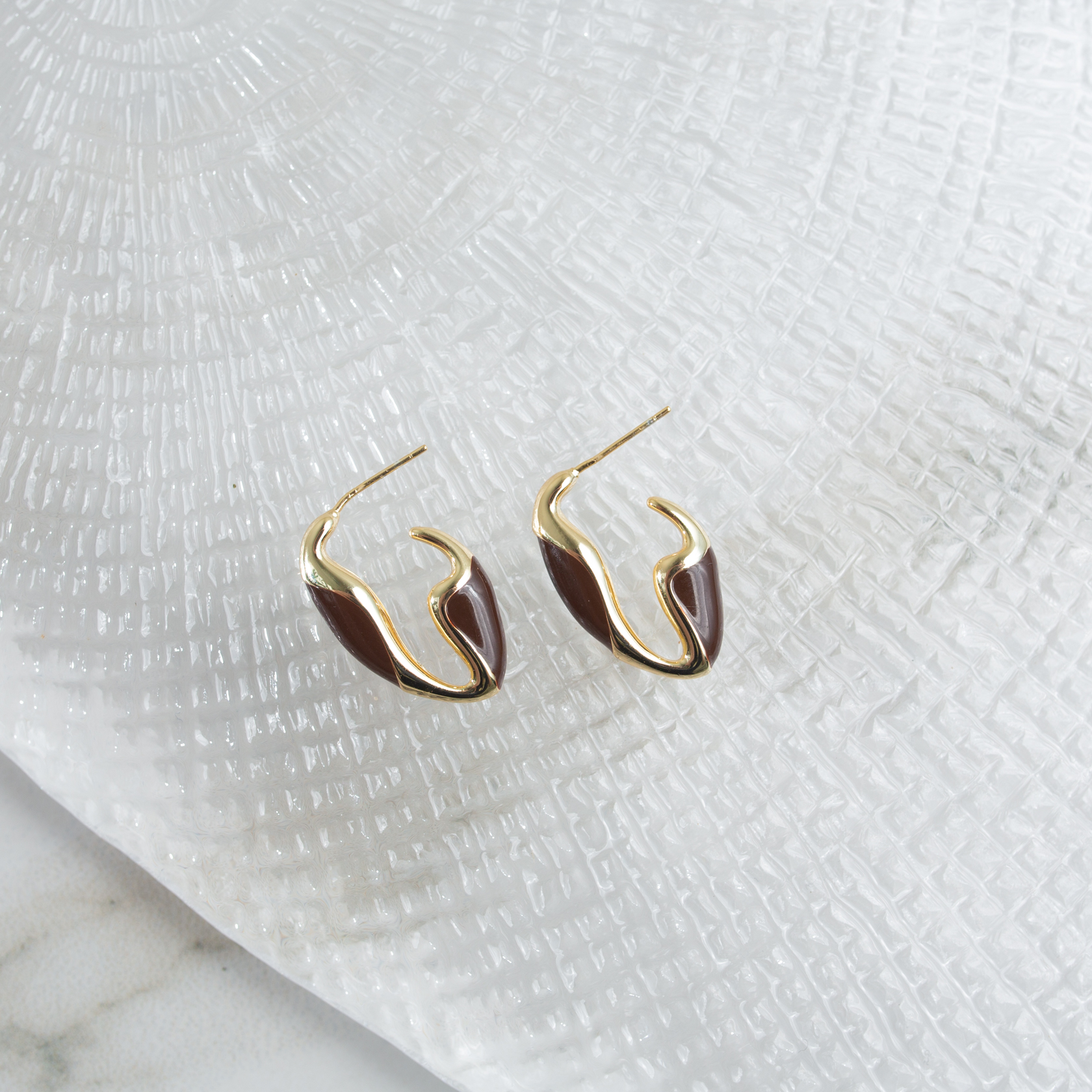 Аккуратные серьги с коричневой эмалью в золотистом исполнении.