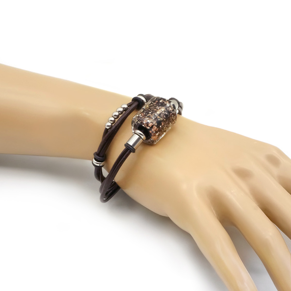 Браслет изготовлен из муранского стекла, натуральной кожи и гипоаллергенной ювелирной стали, что очень важно для людей с чувствительной кожей. Металл не темнеет и не подвергается воздействиям окружающей среды, надолго обеспечивая красивый внешний вид изделия. Крепкий магнитный замок надежно фиксируется на запястье. Ширина браслета - 1,5 см. Размер стеклянной бусины - 1,4x2,3 см. Вес - 17 гр.