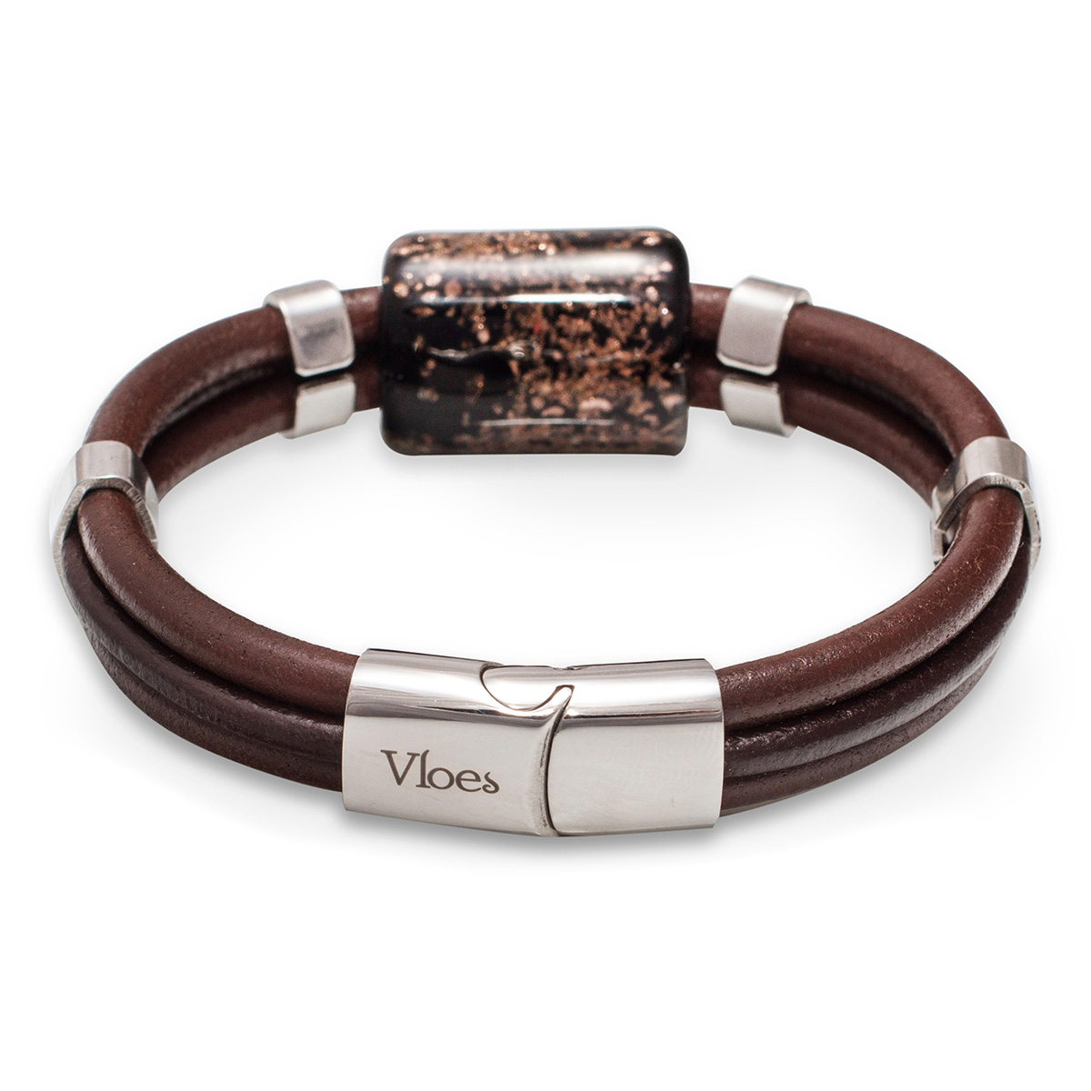 Браслет изготовлен из муранского стекла, натуральной кожи и гипоаллергенной ювелирной стали, что очень важно для людей с чувствительной кожей. Металл не темнеет и не подвергается воздействиям окружающей среды, надолго обеспечивая красивый внешний вид изделия. Крепкий магнитный замок с двойной защитой надежно фиксируется на запястье. Ширина браслета - 1,5 см. Размер стеклянной бусины - 1,9x2,5 см. Вес - 30 гр.