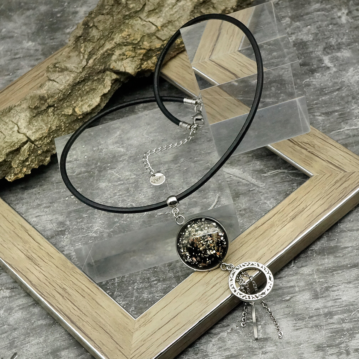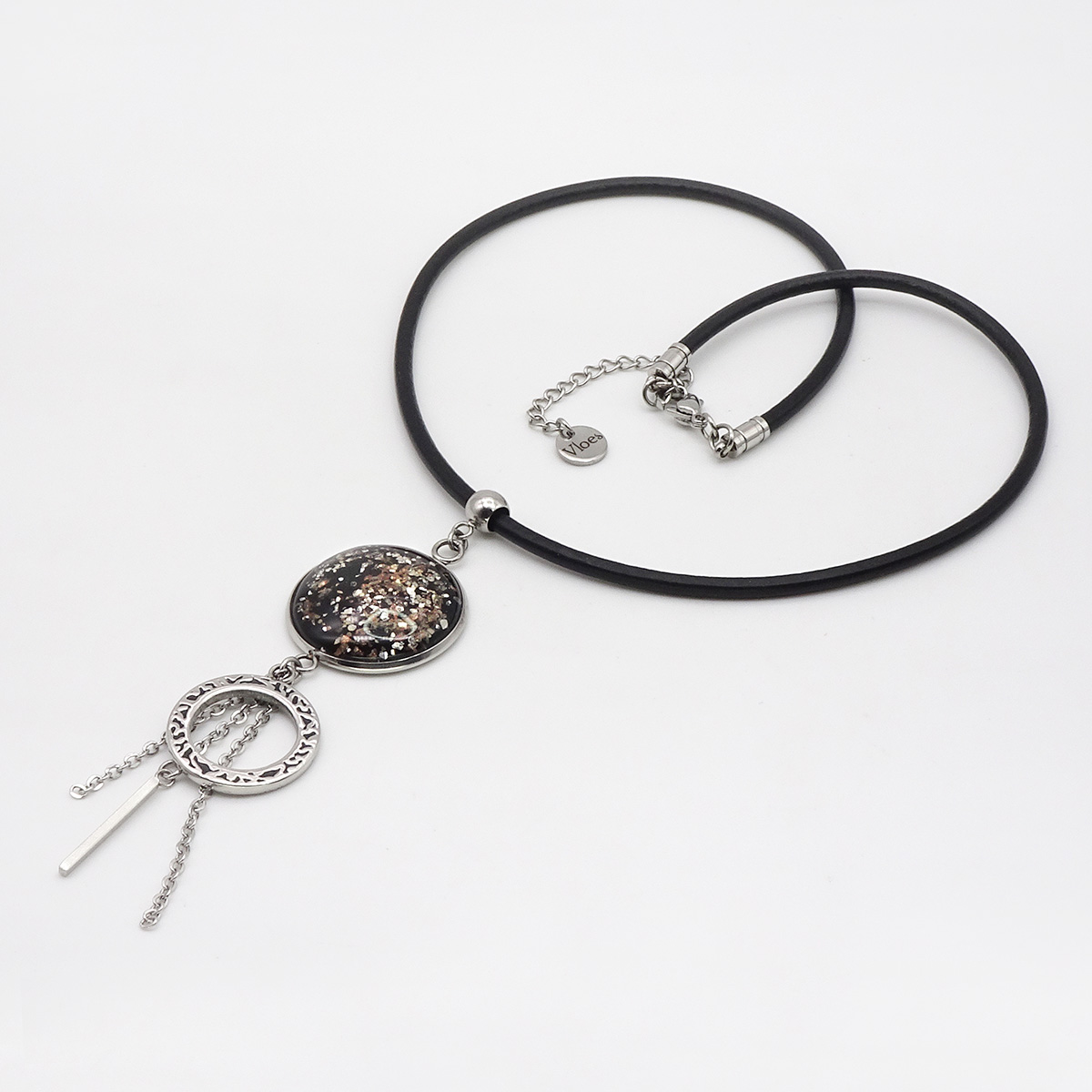 Колье изготовлено из натуральной кожи, муранского стекла и гипоаллергенной ювелирной стали, что очень важно для людей с чувствительной кожей. Металл не темнеет и не подвергается воздействиям окружающей среды, надолго обеспечивая красивый внешний вид изделия. Длина колье - 46 см + 5 см. удлиняющая цепочка. Диаметр стеклянного элемента - 2,5 см. Вес - 16 гр.