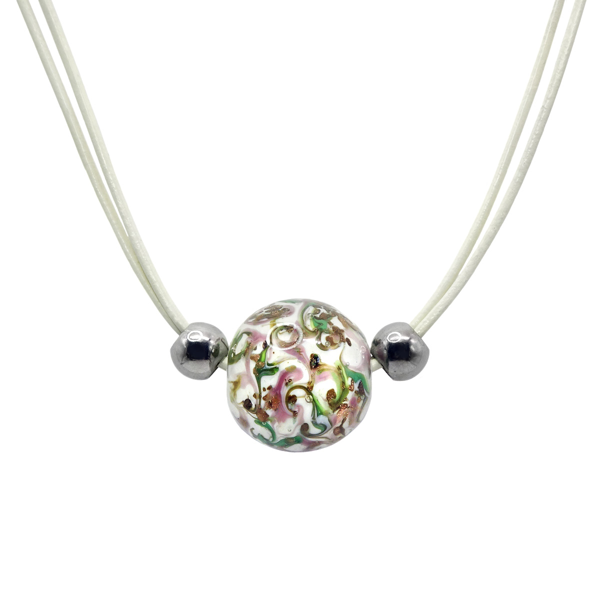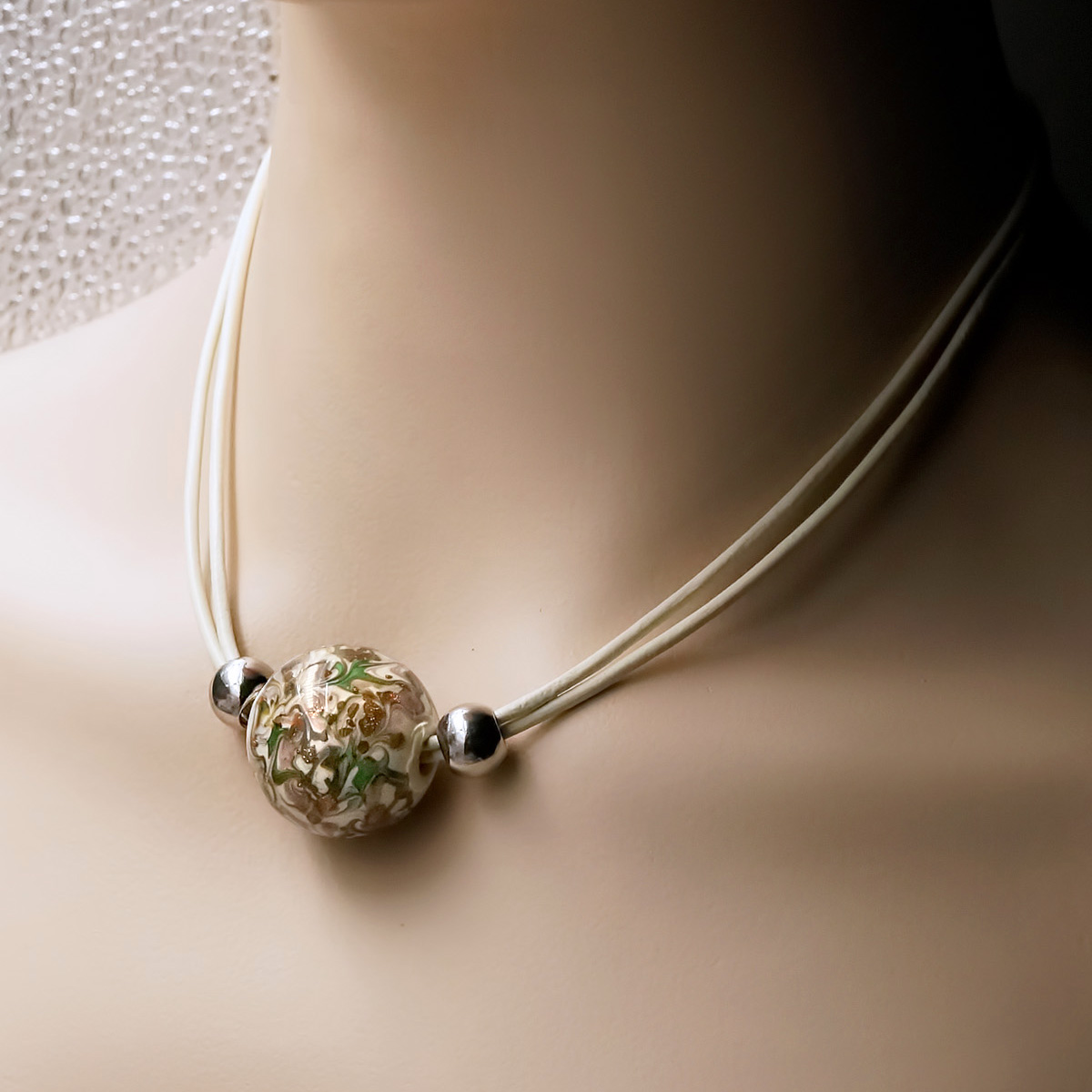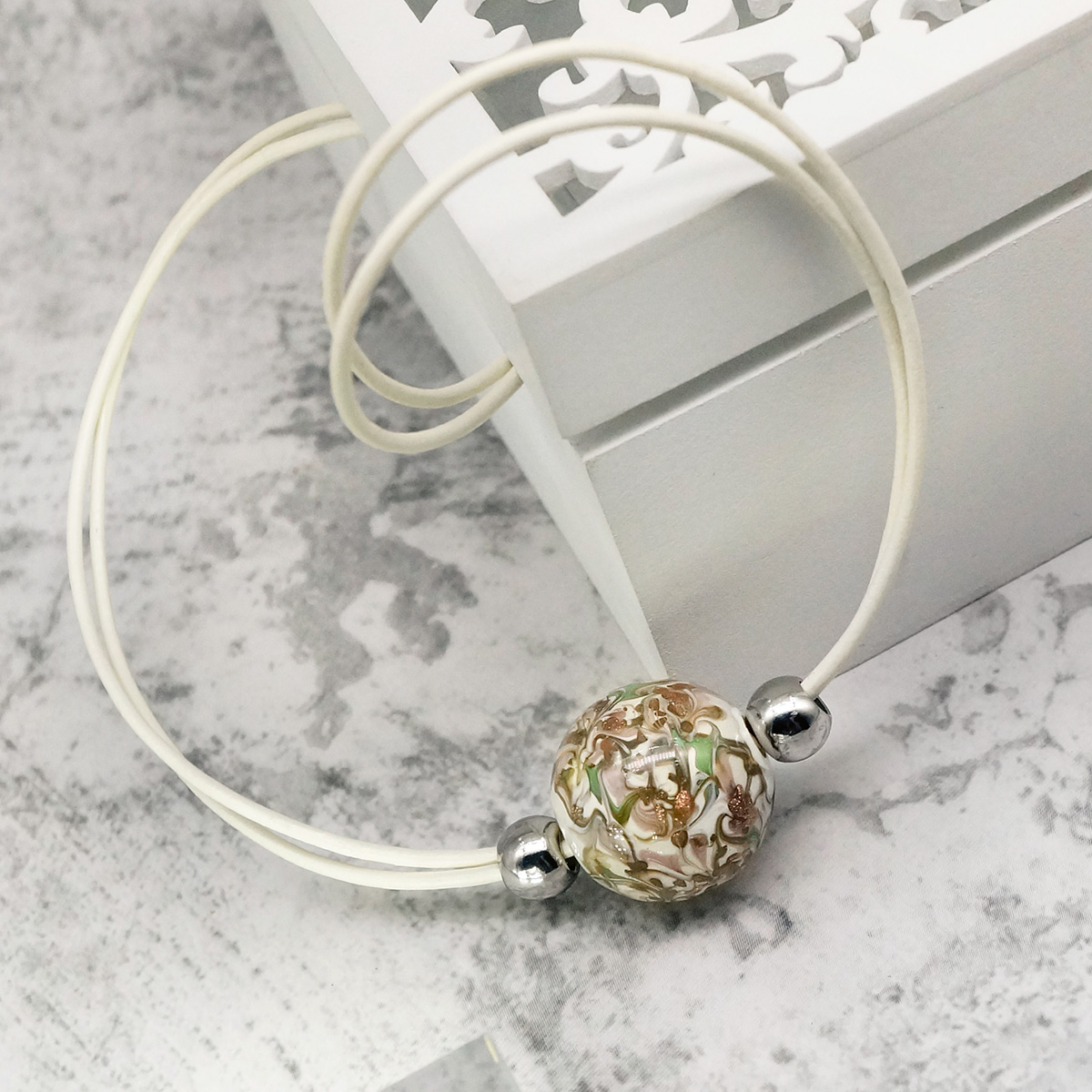 Колье изготовлено из натуральной кожи, муранского стекла и гипоаллергенной ювелирной стали, что очень важно для людей с чувствительной кожей. Металл не темнеет и не подвергается воздействиям окружающей среды, надолго обеспечивая красивый внешний вид изделия. Длина колье - 46 см + 5 см. удлиняющая цепочка. Диаметр стеклянного шара - 2,5 см. Вес - 31 гр.