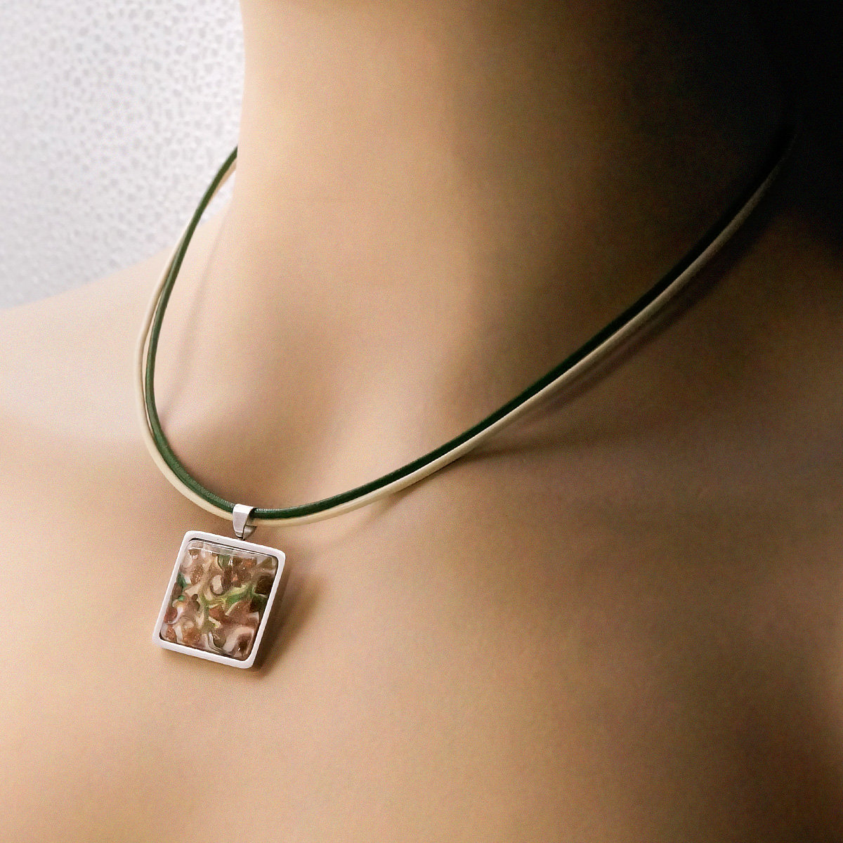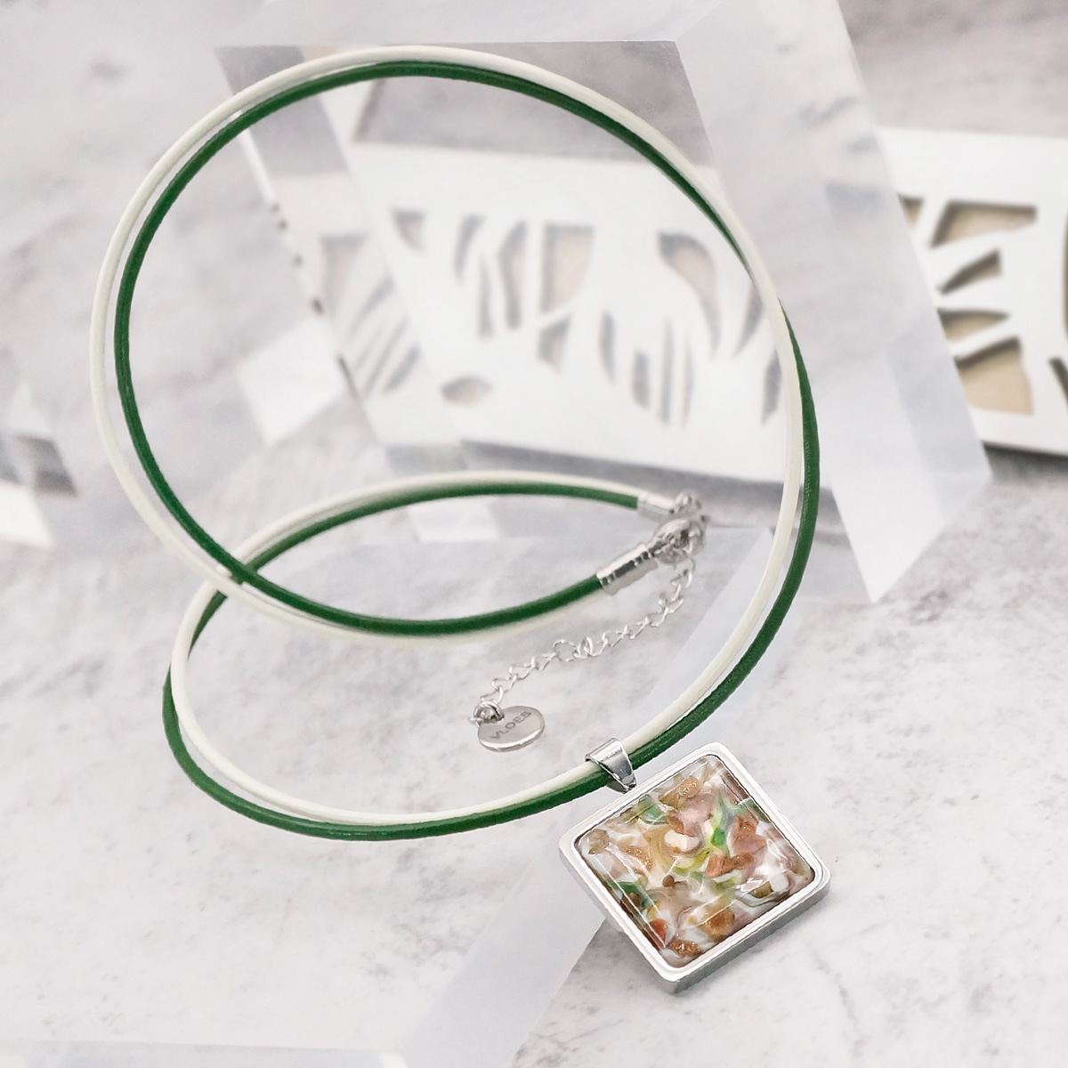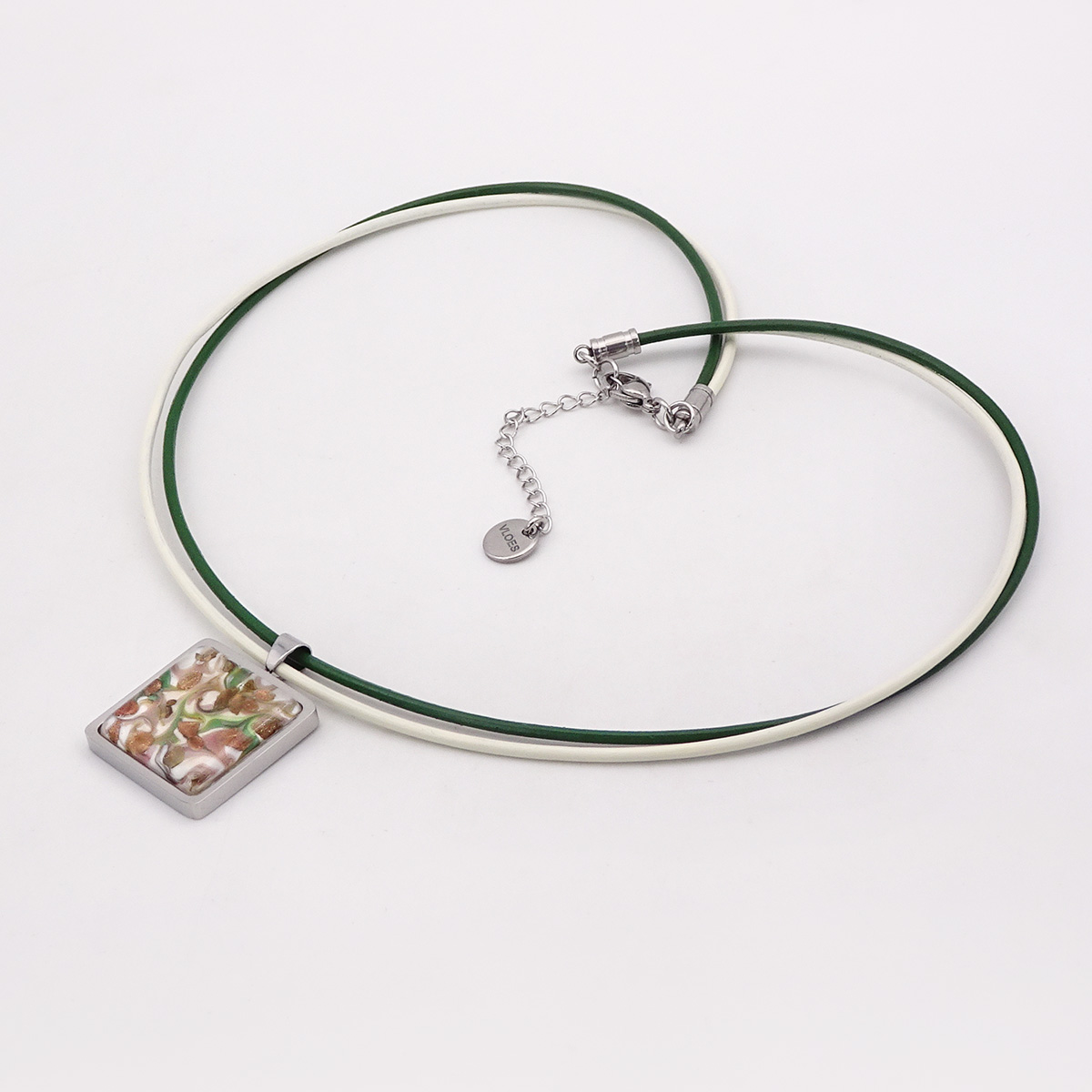 Колье изготовлено из натуральной кожи, муранского стекла и гипоаллергенной ювелирной стали, что очень важно для людей с чувствительной кожей. Металл не темнеет и не подвергается воздействиям окружающей среды, надолго обеспечивая красивый внешний вид изделия. Длина колье - 46 см + 5 см. удлиняющая цепочка. Размер стеклянного элемента - 2,2х2,2 см.  Вес -  18 гр.