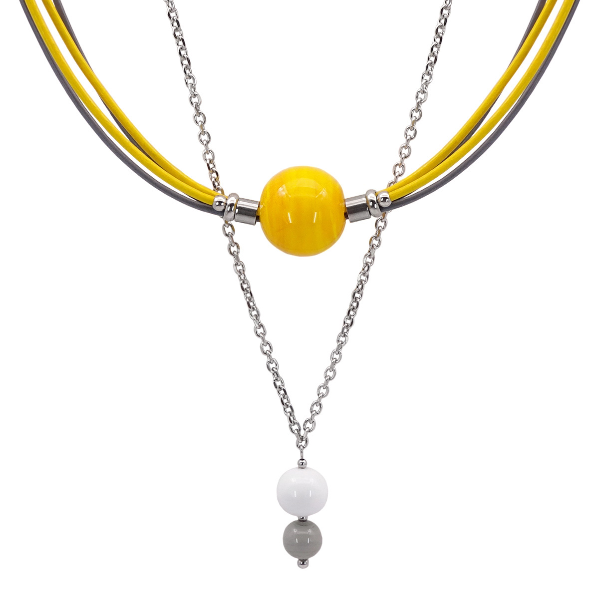 Колье изготовлено из муранского стекла и гипоаллергенной ювелирной стали, что очень важно для людей с чувствительной кожей. Металл не темнеет и не подвергается воздействиям окружающей среды, надолго обеспечивая красивый внешний вид изделия. Длина колье - 43 см + 5 см  удлиняющая цепочка, длина до подвески шар - 51 см. Диаметр стеклянных шаров - 2, 1,2 и 0,8 см. Вес - 32