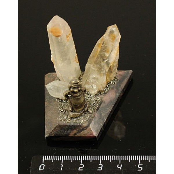 Сувенир 5х5х4см из кристаллов горного хрусталя на яшме уральской, с фигуркой мастера