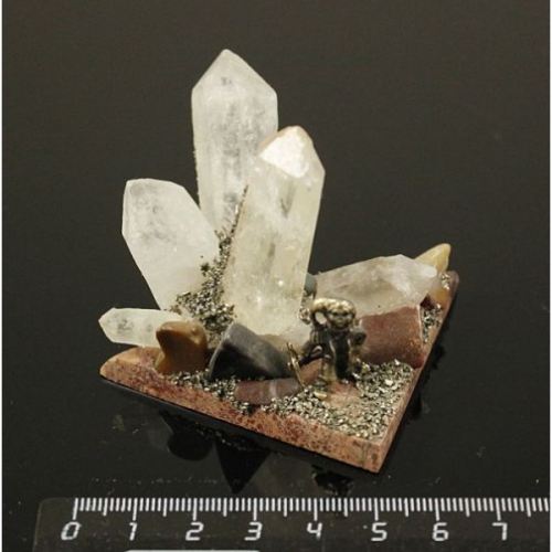 Сувенир 6х7х3см из кристаллов горного хрусталя на яшме уральской, с фигуркой мастера