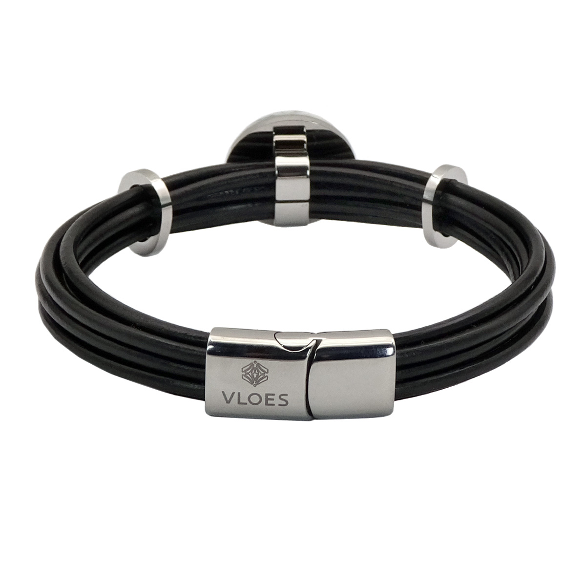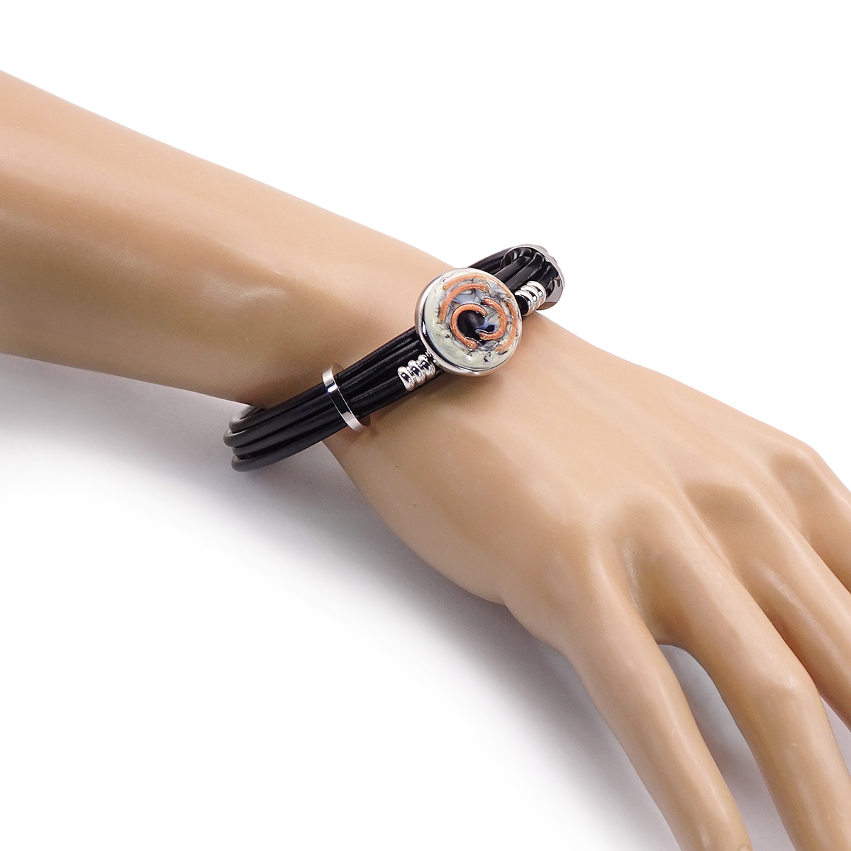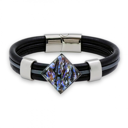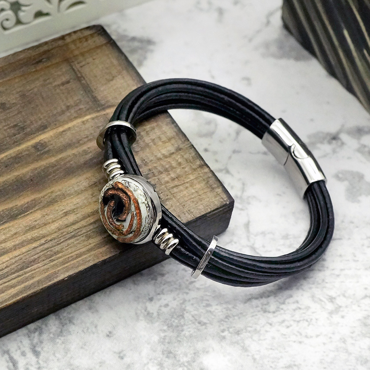 Браслет изготовлен из муранского стекла, натуральной кожи и гипоаллергенной ювелирной стали, что очень важно для людей с чувствительной кожей. Металл не темнеет и не подвергается воздействиям окружающей среды, надолго обеспечивая красивый внешний вид изделия. Крепкий магнитный замок с двойной защитой надежно фиксируется на запястье. Ширина браслета - 1,5 см. Диаметр стеклянного элемента - 2 см. Вес - 25 гр.