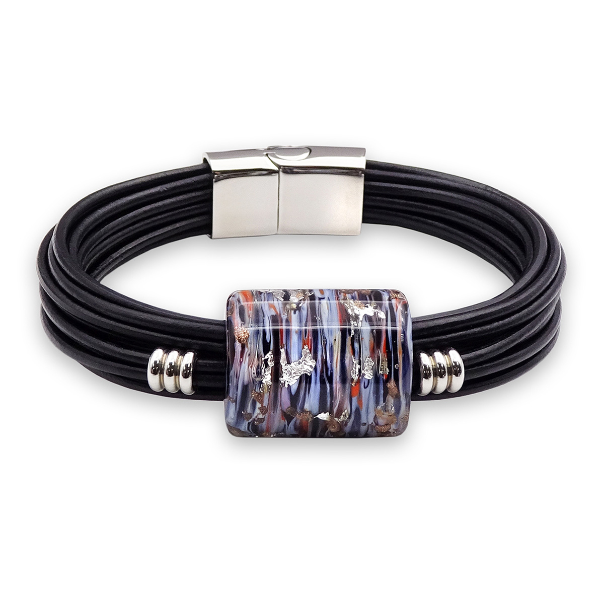 Браслет изготовлен из муранского стекла, натуральной кожи и гипоаллергенной ювелирной стали, что очень важно для людей с чувствительной кожей. Металл не темнеет и не подвергается воздействиям окружающей среды, надолго обеспечивая красивый внешний вид изделия. Крепкий магнитный замок с двойной защитой надежно фиксируется на запястье. Ширина браслета - 1,5 см. Размер стеклянной бусины - 1,9*2,5 см. Вес - 31 гр.