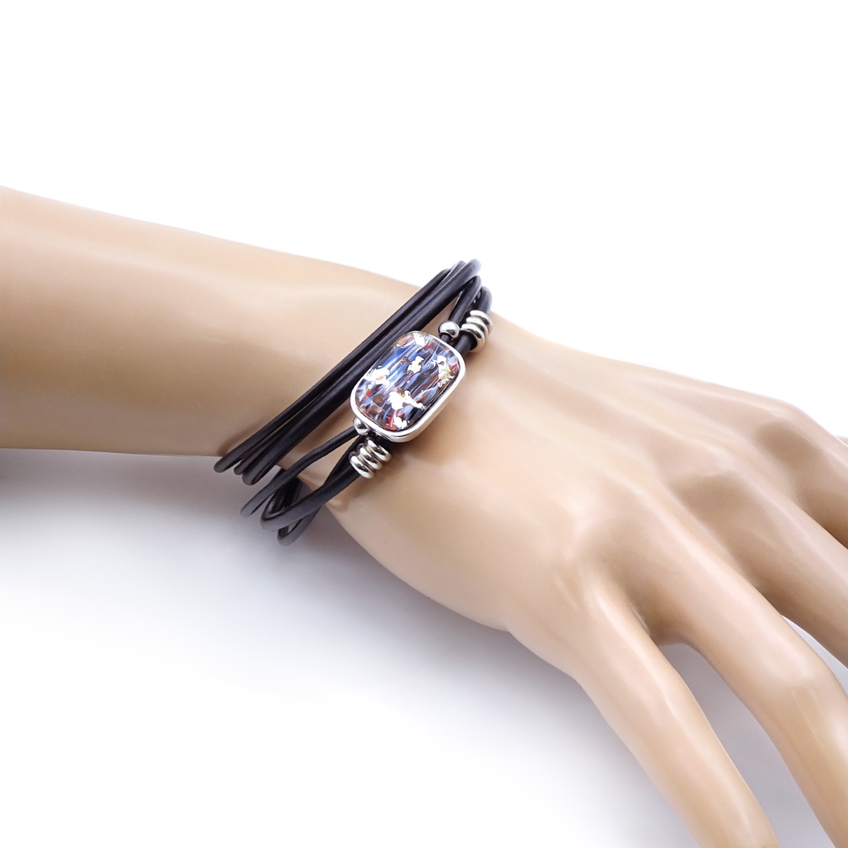 Браслет изготовлен из муранского стекла, натуральной кожи и гипоаллергенной ювелирной стали, что очень важно для людей с чувствительной кожей. Металл не темнеет и не подвергается воздействиям окружающей среды, надолго обеспечивая красивый внешний вид изделия. Крепкий магнитный замок надежно фиксируется на запястье. Ширина браслета - 1 см. Размер стеклянного элемента - 2*1,5 см. Вес - 15 гр.
