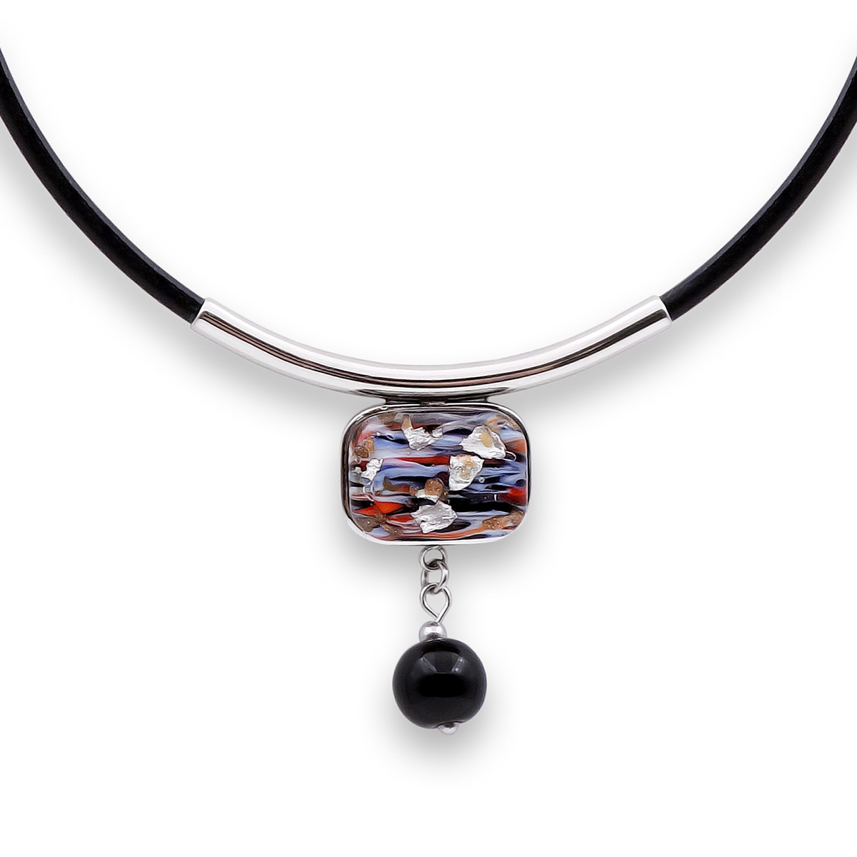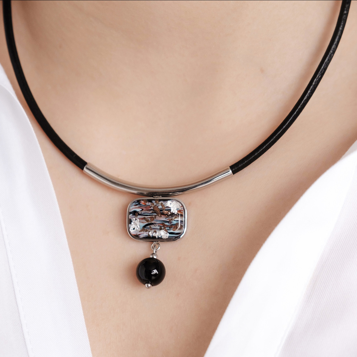 Колье изготовлено из натуральной кожи, муранского стекла и гипоаллергенной ювелирной стали, что очень важно для людей с чувствительной кожей. Металл не темнеет и не подвергается воздействиям окружающей среды, надолго обеспечивая красивый внешний вид изделия. Длина колье - 46 см + 5 см. удлиняющая цепочка. Длина кулона - 3 см. Размер стеклянного элемента - 2х1,5 см, шар - 1 см. Вес - 14 гр.