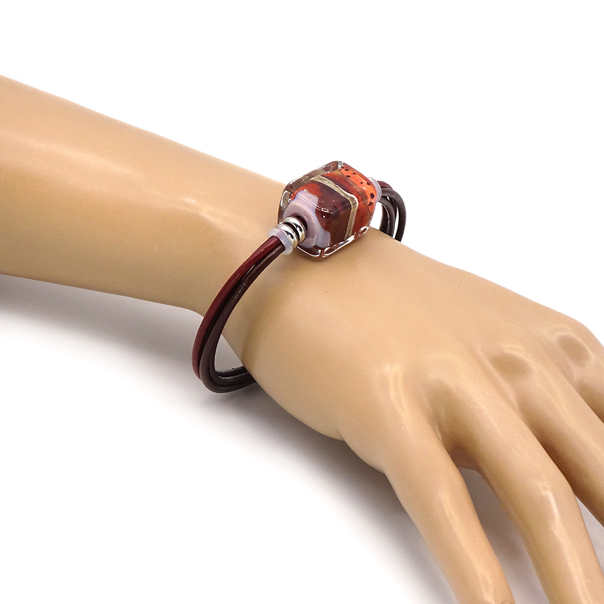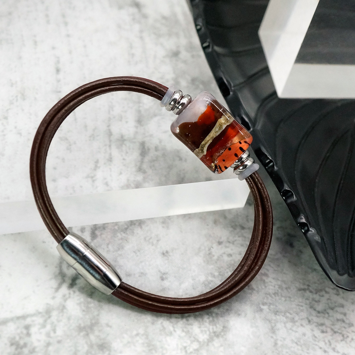 Браслет изготовлен из муранского стекла, натуральной кожи и гипоаллергенной ювелирной стали, что очень важно для людей с чувствительной кожей. Металл не темнеет и не подвергается воздействиям окружающей среды, надолго обеспечивая красивый внешний вид изделия. Крепкий магнитный замок надежно фиксируется на запястье. Ширина браслета - 0,5 см. Размер стеклянного элемента - 1,8х1,5 см. Вес -  16 гр.