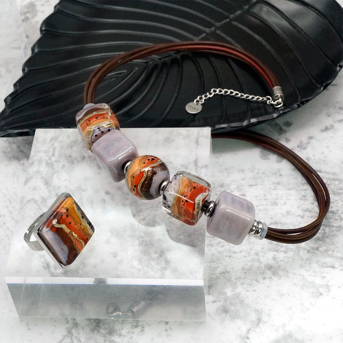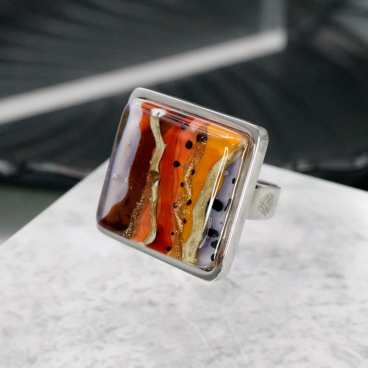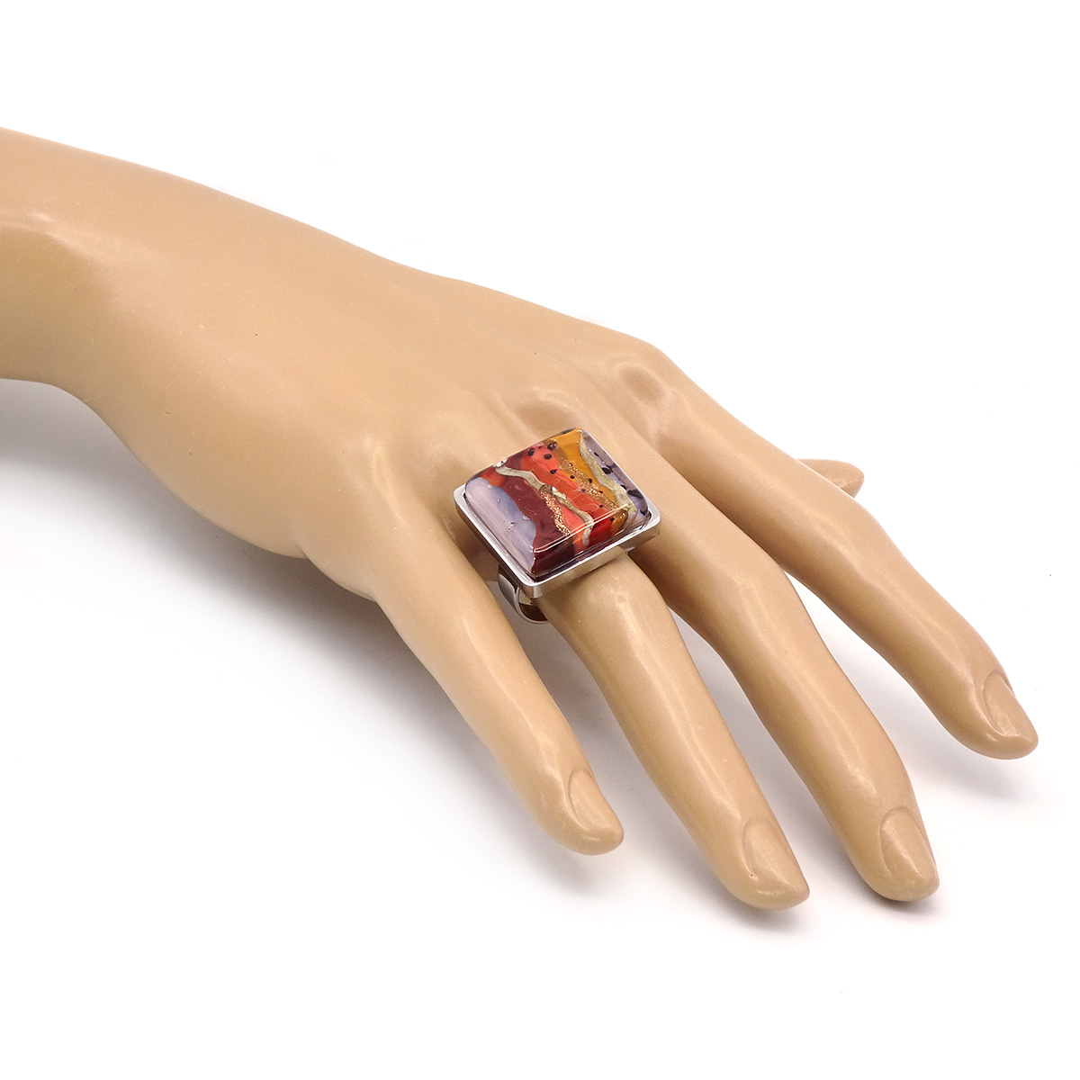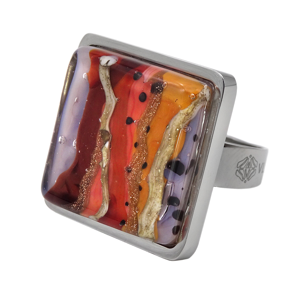 Кольцо изготовлено из муранского стекла и гипоаллергенной ювелирной стали, что очень важно для людей с чувствительной кожей. Металл не темнеет и не подвергается воздействиям окружающей среды, надолго обеспечивая красивый внешний вид изделия. Размер стеклянного элемента - 2*2 см. Кольцо безразмерное, регулируется с 16 до 19 размера. Вес - 11 гр.