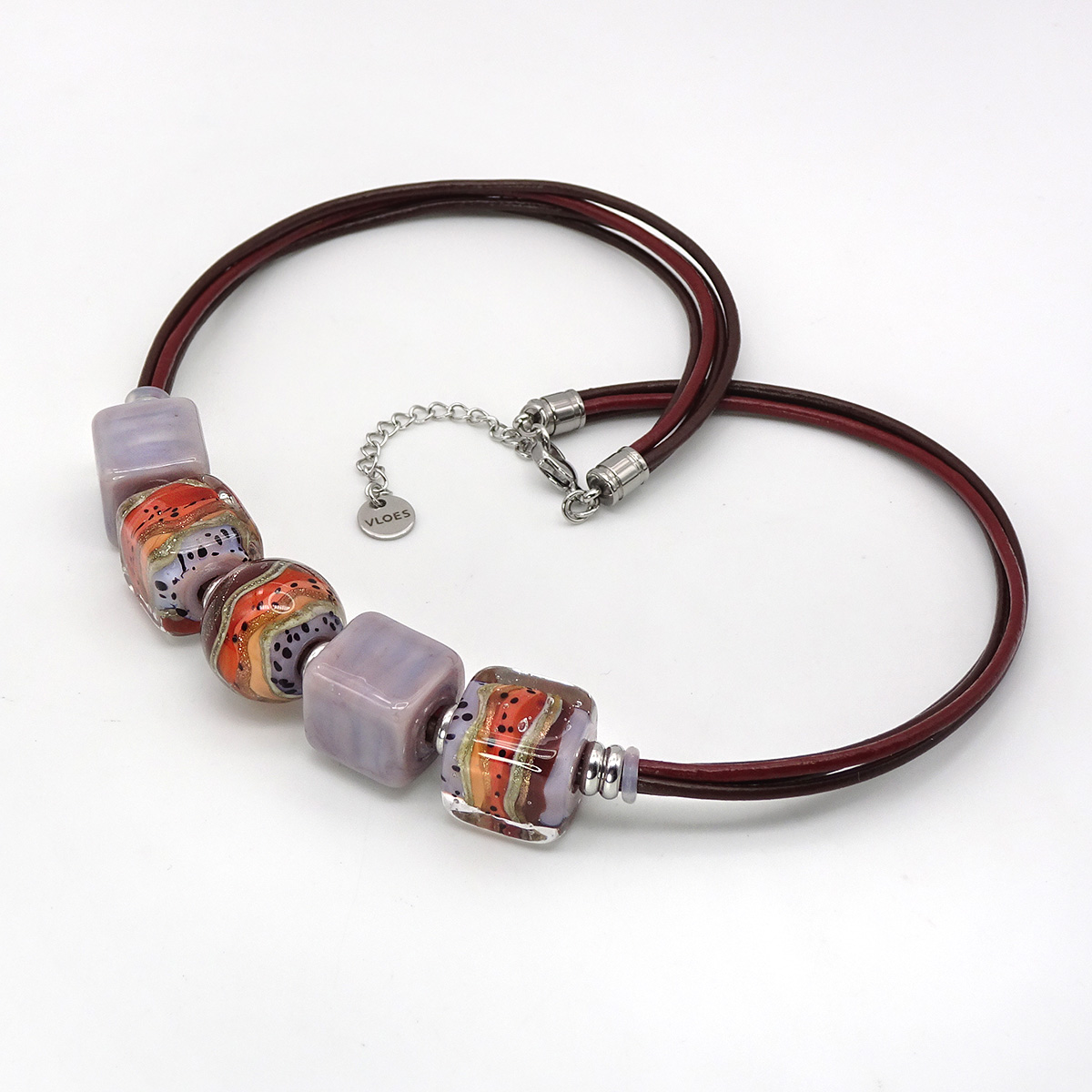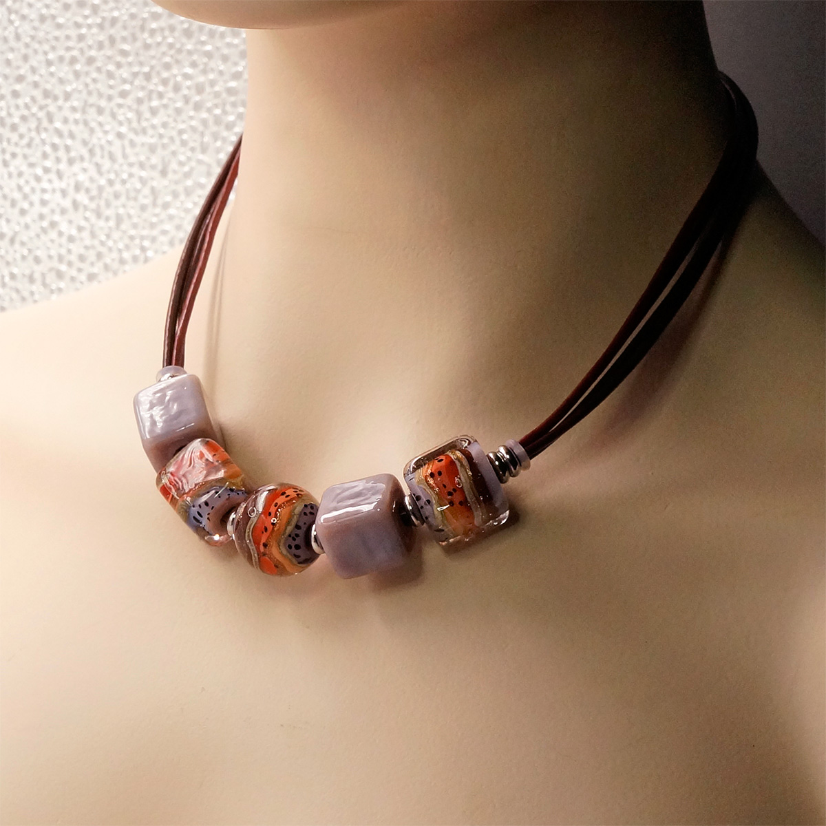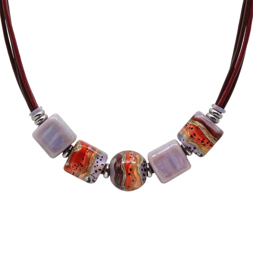 Колье изготовлено из натуральной кожи, муранского стекла и гипоаллергенной ювелирной стали, что очень важно для людей с чувствительной кожей. Металл не темнеет и не подвергается воздействиям окружающей среды, надолго обеспечивая красивый внешний вид изделия. Длина колье - 46 см + 5 см. удлиняющая цепочка. Диаметр стеклянной бусины  - 2 см, размер кубов - 1,5*1,5 см. Вес - 46 гр.