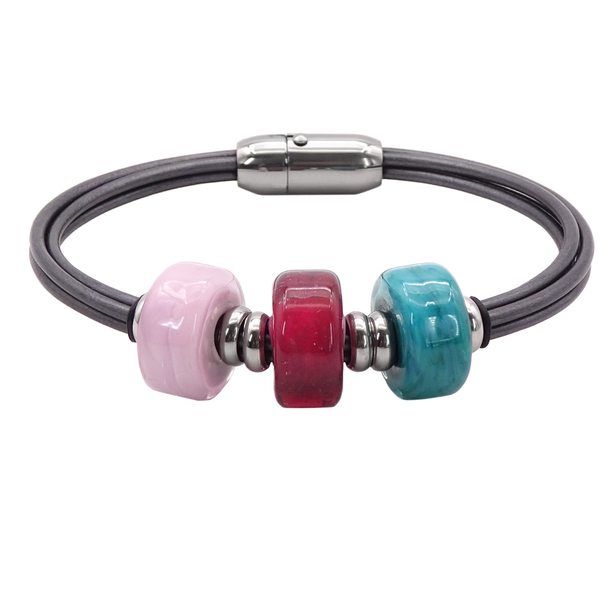 Браслет изготовлен из муранского стекла, натуральной кожи и гипоаллергенной ювелирной стали, что очень важно для людей с чувствительной кожей. Металл не темнеет и не подвергается воздействиям окружающей среды, надолго обеспечивая красивый внешний вид изделия. Размер стеклянных ронделей 0,7*1,5 см - см. Вес - 23 гр.