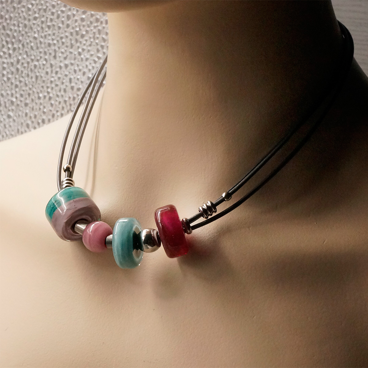Колье изготовлено из натуральной кожи, муранского стекла и гипоаллергенной ювелирной стали, что очень важно для людей с чувствительной кожей. Металл не темнеет и не подвергается воздействиям окружающей среды, надолго обеспечивая красивый внешний вид изделия. Длина колье - 50 см + 5 см. удлиняющая цепочка. Размер стеклянных ронделей - 1,4*2, 0,7*2, 1*2 см. Диаметр стеклянного шара - 1,2 см. Вес - 38 гр.