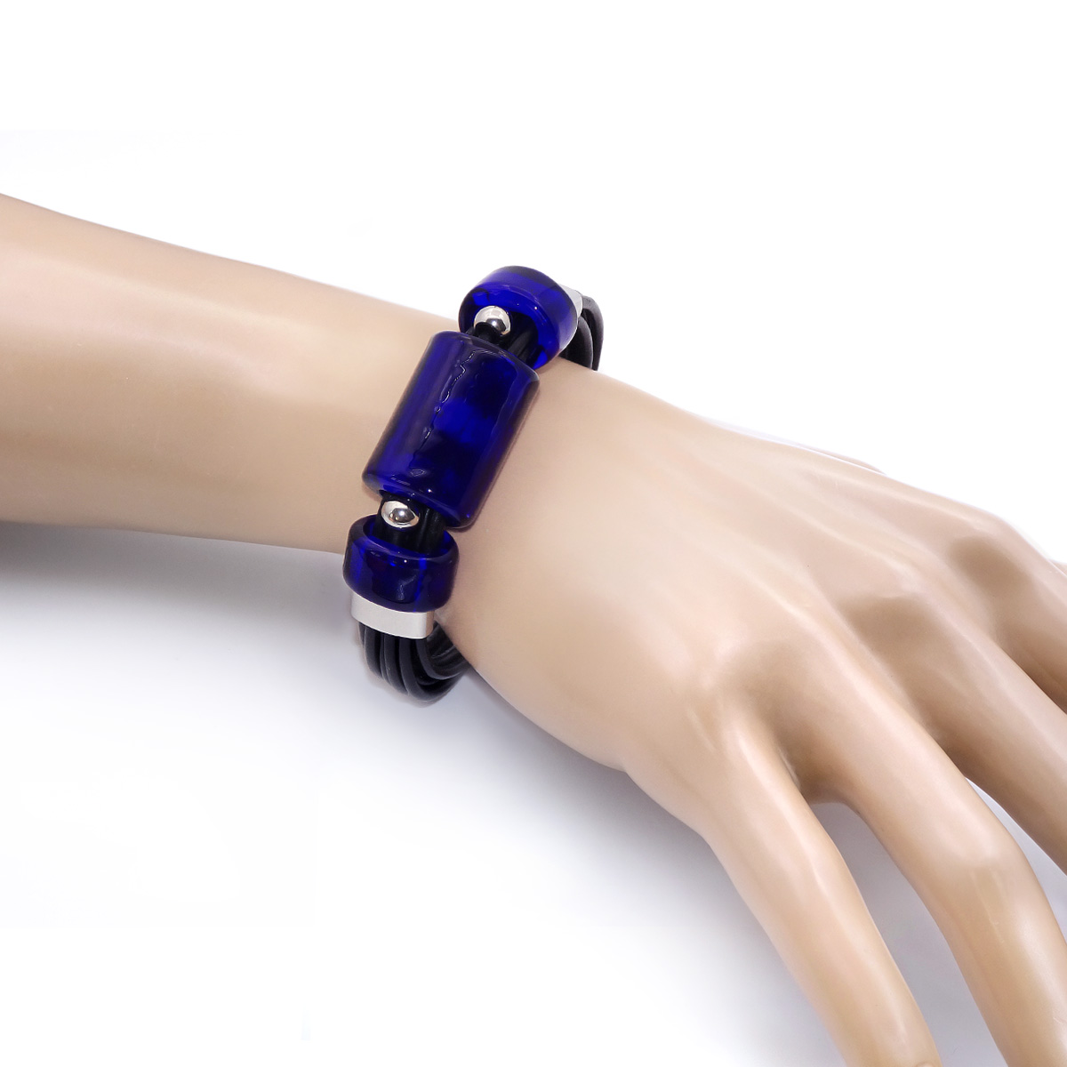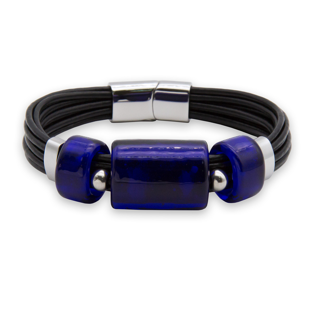 Браслет изготовлен из муранского стекла, натуральной кожи и гипоаллергенной ювелирной стали, что очень важно для людей с чувствительной кожей. Металл не темнеет и не подвергается воздействиям окружающей среды, надолго обеспечивая красивый внешний вид изделия. Крепкий магнитный замок с двойной защитой надежно фиксируется на запястье. Ширина браслета - 1,5 см. Размер стеклянных бусин - 1,9x2,5 и 1,9x1 см. Вес - 35 гр.