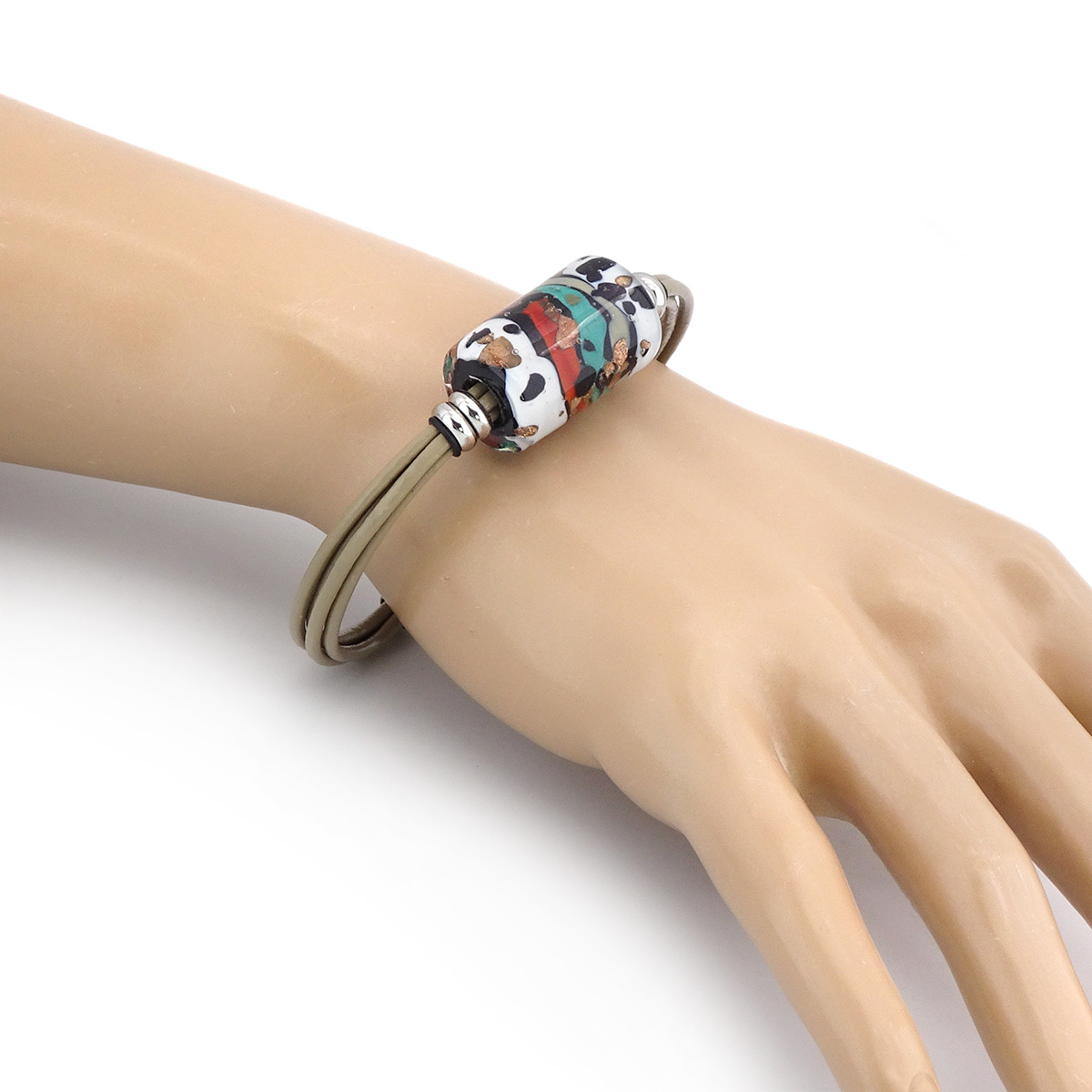 Браслет изготовлен из муранского стекла, натуральной кожи и гипоаллергенной ювелирной стали, что очень важно для людей с чувствительной кожей. Металл не темнеет и не подвергается воздействиям окружающей среды, надолго обеспечивая красивый внешний вид изделия. Крепкий магнитный замок с двойной защитой надежно фиксируется на запястье. Ширина браслета - 0,5 см. Размер стеклянной бусины - 1,9x2,5 см. Вес - 27 гр.