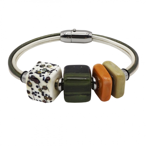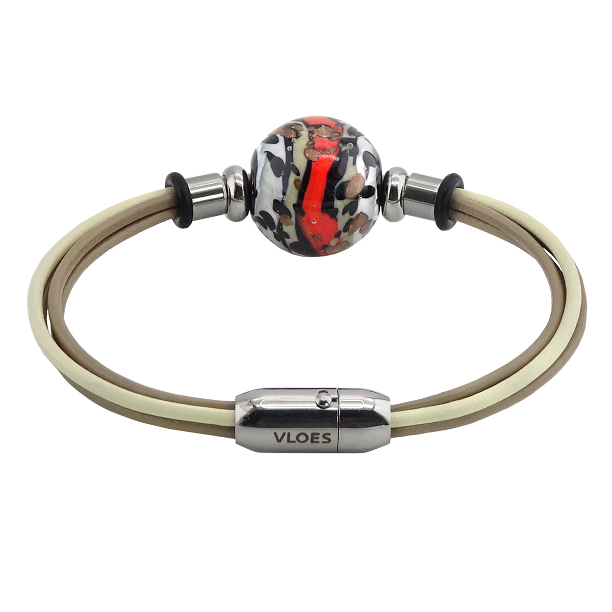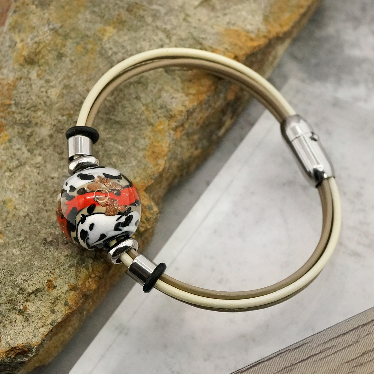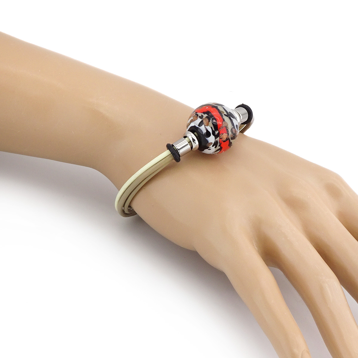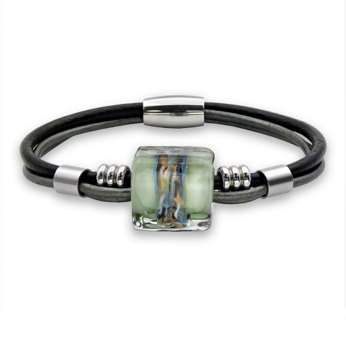 Браслет изготовлен из муранского стекла, натуральной кожи и гипоаллергенной ювелирной стали, что очень важно для людей с чувствительной кожей. Металл не темнеет и не подвергается воздействиям окружающей среды, надолго обеспечивая красивый внешний вид изделия. Крепкий магнитный замок надежно фиксируется на запястье. Ширина браслета - 0,5 см.  Диаметр стеклянного шара 1,8 см.  Вес - 15 гр.