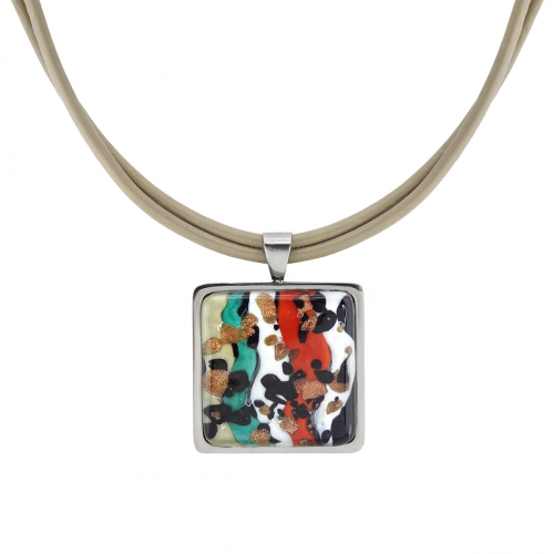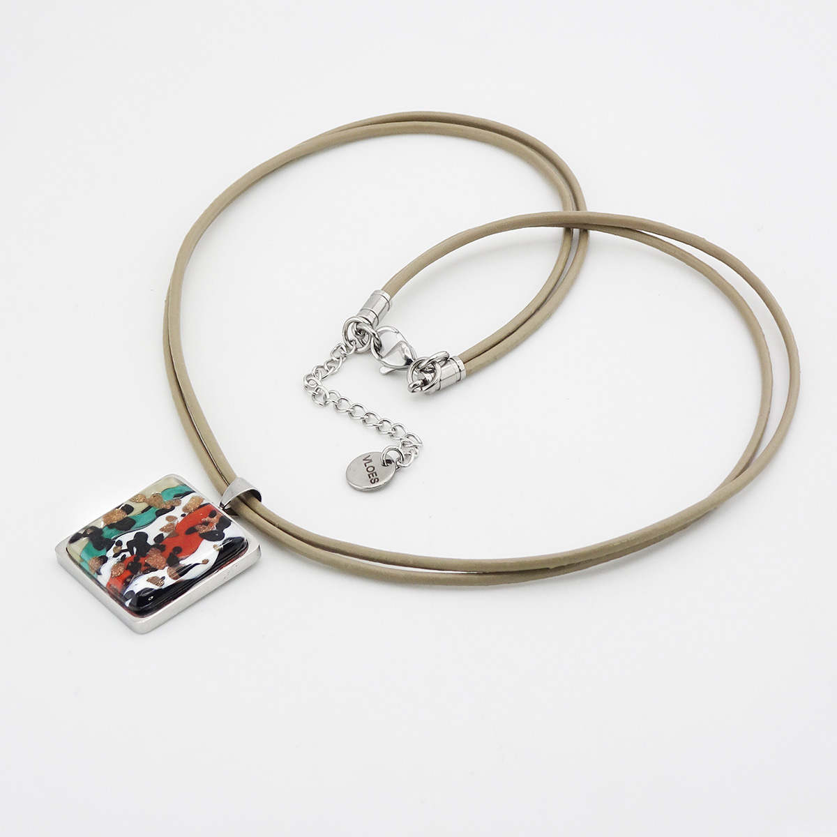 Колье изготовлено из натуральной кожи, муранского стекла и гипоаллергенной ювелирной стали, что очень важно для людей с чувствительной кожей. Металл не темнеет и не подвергается воздействиям окружающей среды, надолго обеспечивая красивый внешний вид изделия. Длина колье - 46 см + 5 см. удлиняющая цепочка. Размер стеклянного элемента - 2,2х2,2 см.  Вес - 19 гр.