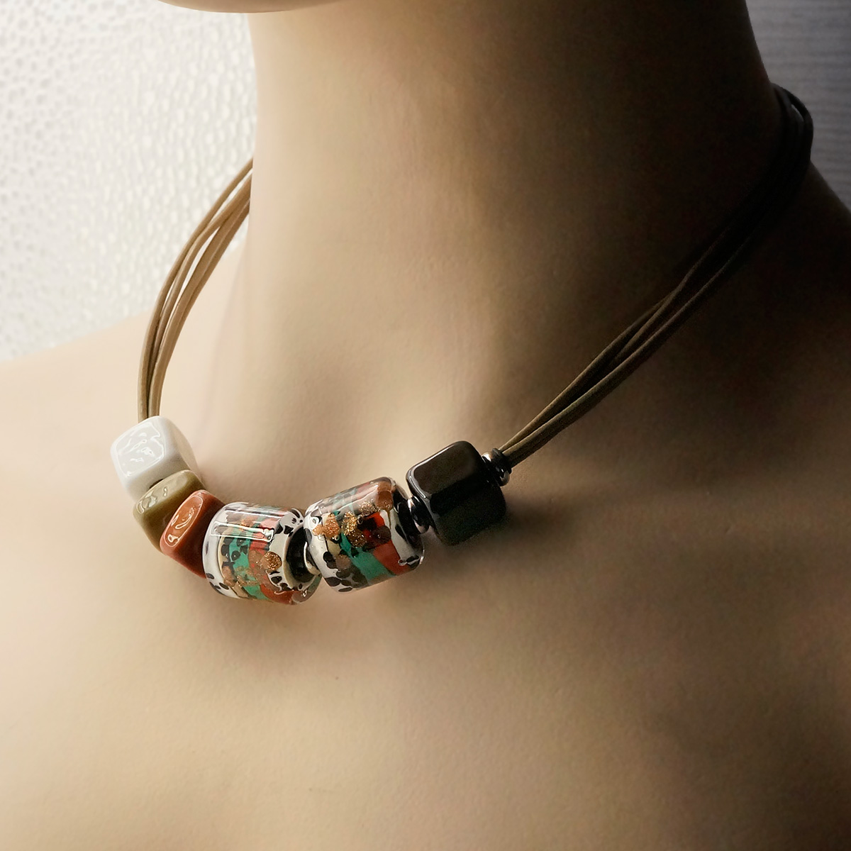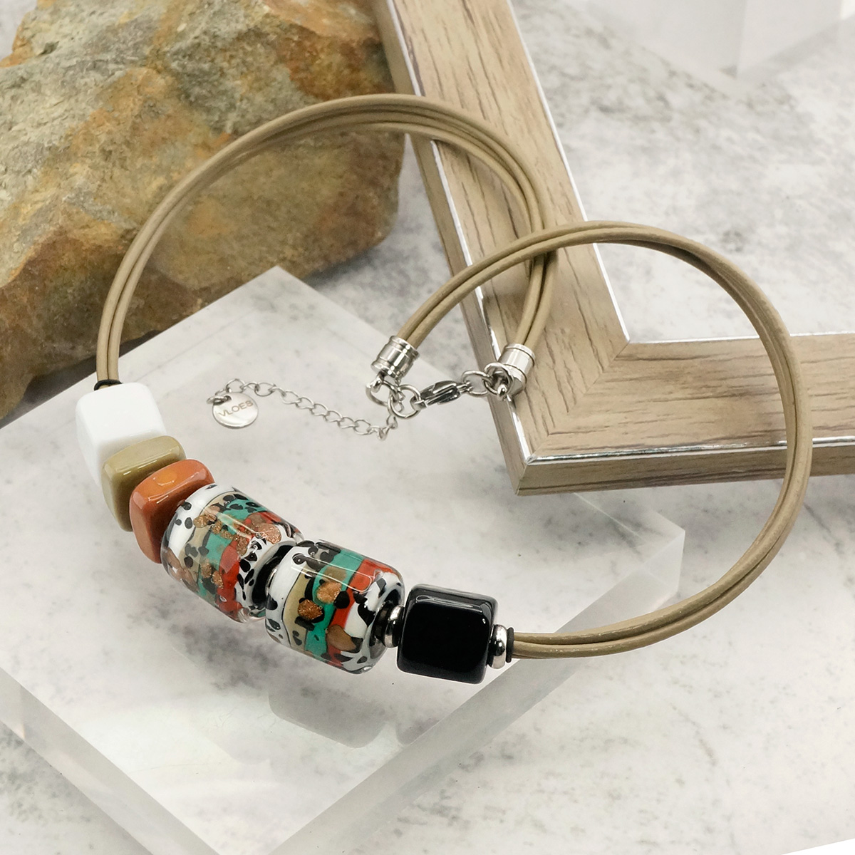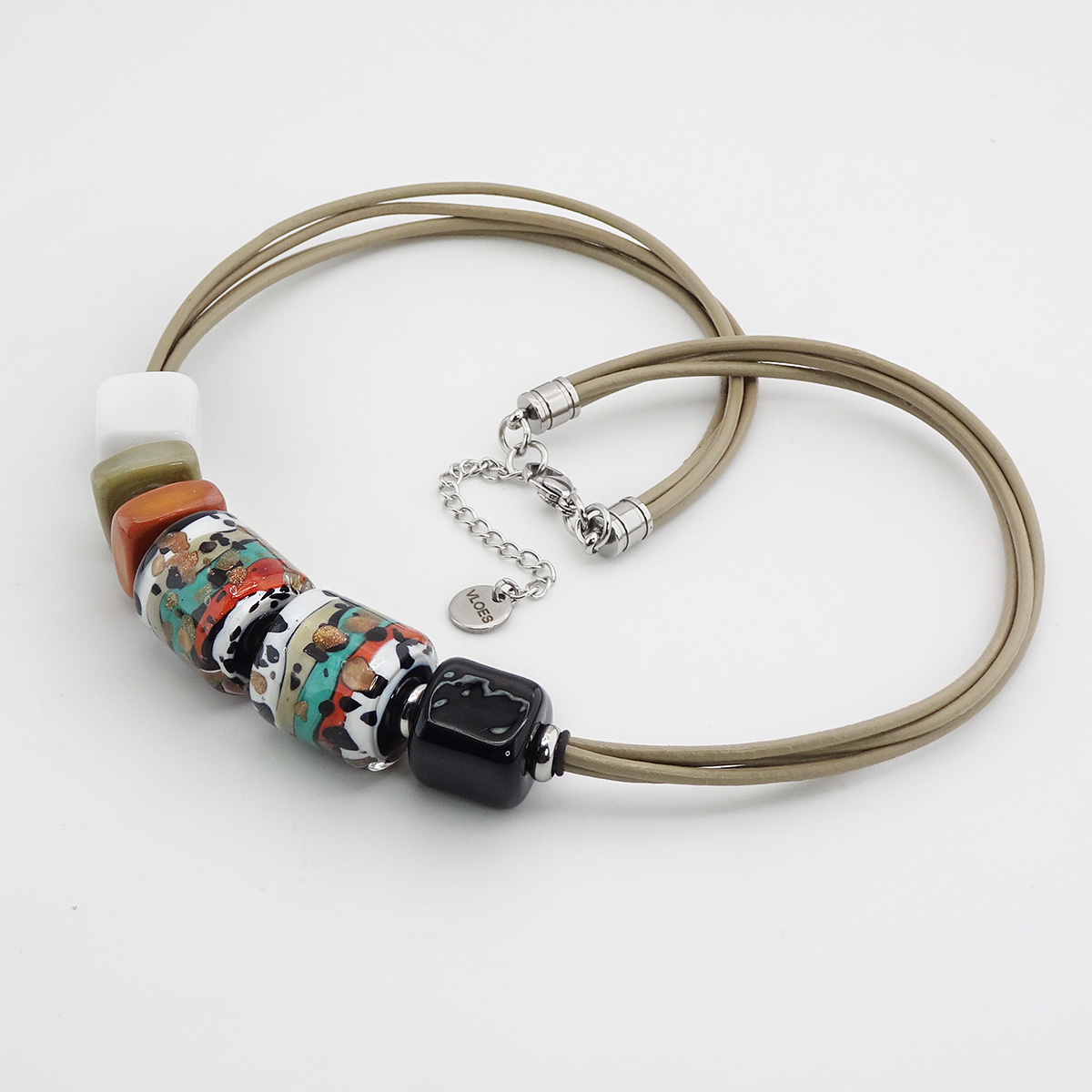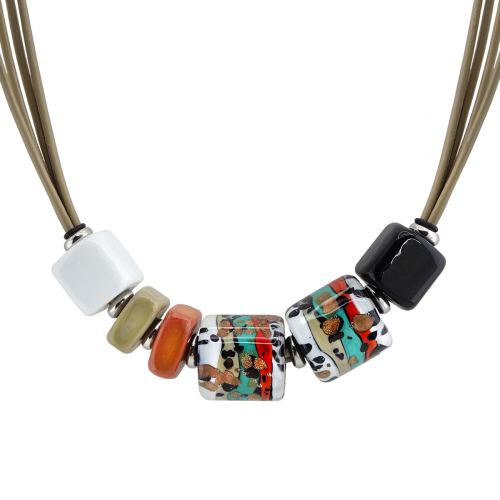 Колье изготовлено из натуральной кожи, муранского стекла и гипоаллергенной ювелирной стали, что очень важно для людей с чувствительной кожей. Металл не темнеет и не подвергается воздействиям окружающей среды, надолго обеспечивая красивый внешний вид изделия. Длина колье - 46 см + 5 см. удлиняющая цепочка. Размер стеклянных элементов - 1,6*1,4, 1*1 и 1,2*1, и рандели 1,4*0,5 см. Вес - 44 гр.