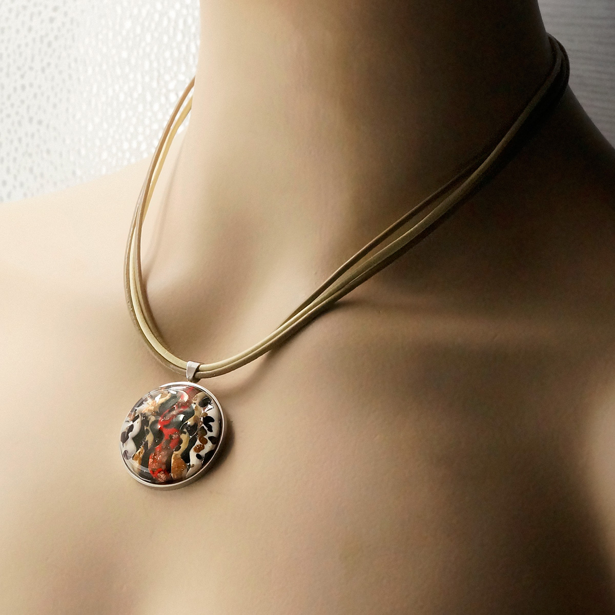 Колье изготовлено из натуральной кожи, муранского стекла и гипоаллергенной ювелирной стали, что очень важно для людей с чувствительной кожей. Металл не темнеет и не подвергается воздействиям окружающей среды, надолго обеспечивая красивый внешний вид изделия. Длина колье - 46 см + 5 см. удлиняющая цепочка. Диаметр стеклянного элемента - 3 см. Вес - 23 гр.