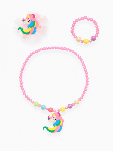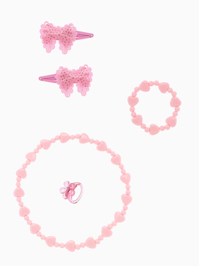 [Картинка122]Нежный розовый комплект украшений для девочек включает браслет, кольцо диаметром 5 см, бусы длиной 40 см и две заколки с изящными бантиками и сердечками. Все элементы изготовлены из лёгкого пластика и текстиля, что обеспечивает комфорт и безопасность при носке.