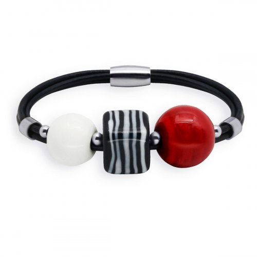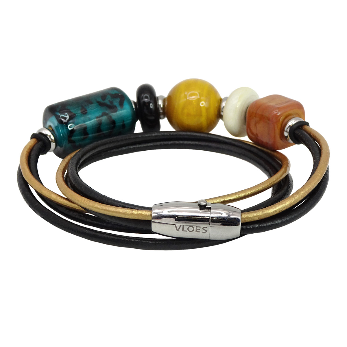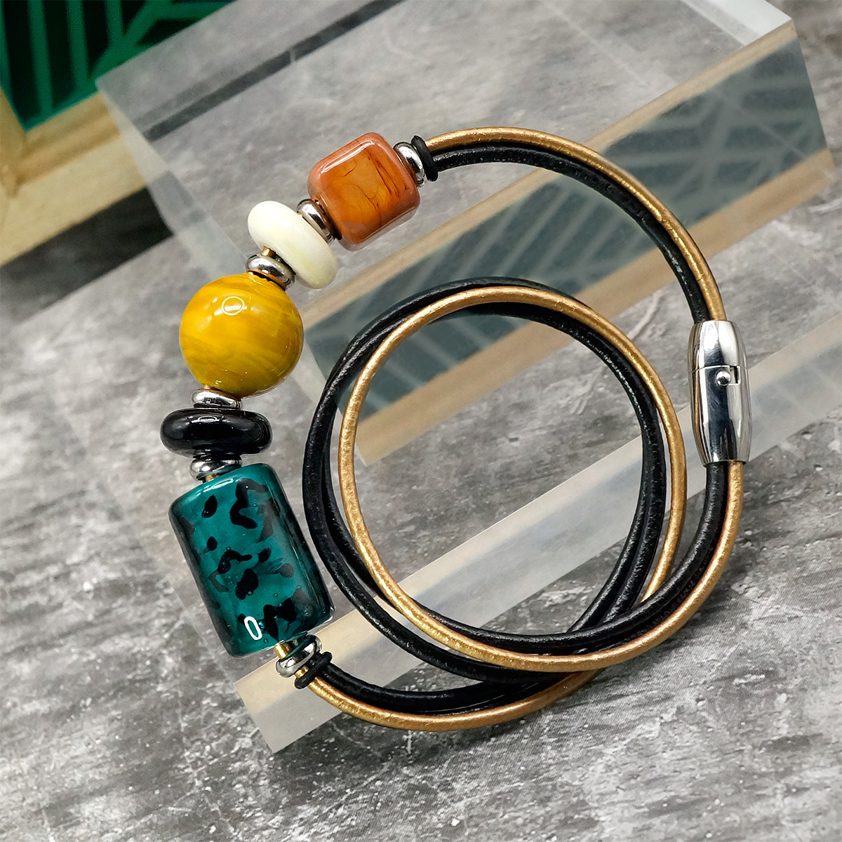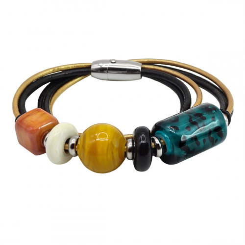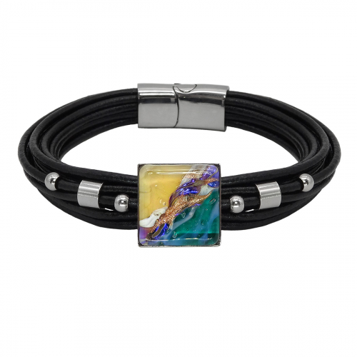 Браслет изготовлен из муранского стекла, натуральной кожи и гипоаллергенной ювелирной стали, что очень важно для людей с чувствительной кожей. Металл не темнеет и не подвергается воздействиям окружающей среды, надолго обеспечивая красивый внешний вид изделия. Размер стеклянных элементов - 1,2*1,2, 0,5, 2,2*1,4 см. Диаметр стеклянного шара - 1,5см. Вес - 30 гр.