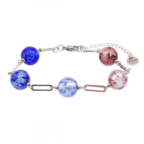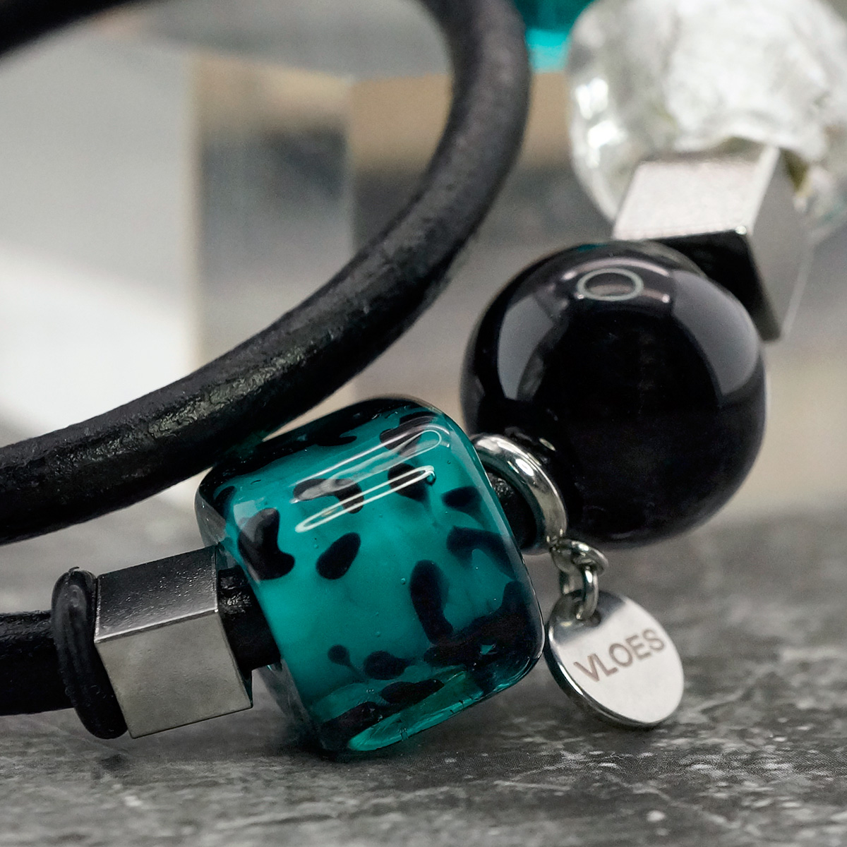 Браслет изготовлен из муранского стекла, натуральной кожи и гипоаллергенной ювелирной стали, что очень важно для людей с чувствительной кожей. Металл не темнеет и не подвергается воздействиям окружающей среды, надолго обеспечивая красивый внешний вид изделия. Размер стеклянных элементов - 1,4*1,4, 0,8, 1,2*1,2 см. Диаметр стеклянного шара - 1,5см. Вес - 30 гр.