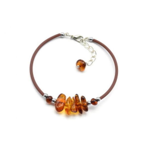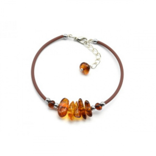 Женский браслет каучук с янтарем галтовка цвет коньячный, 16см.