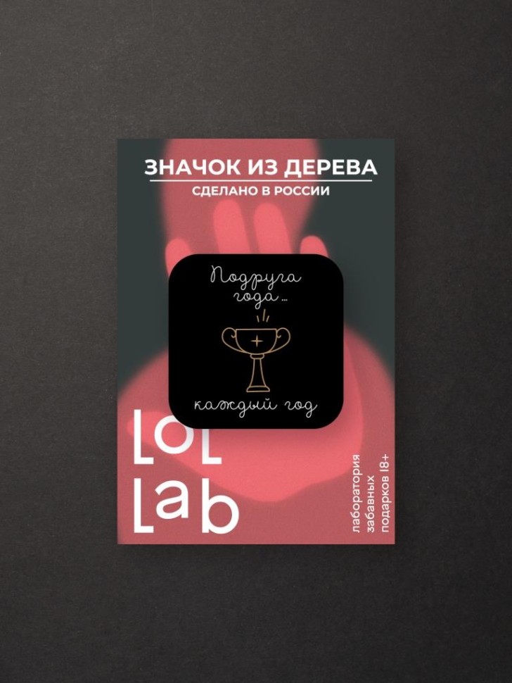 Значок выполнен из дерева с нанесением принта. На тыльной стороне застёжка в виде английской булавки. Каждый значок размещен на подложке и упакован в полиэтиленовый пакет с европодвесом.