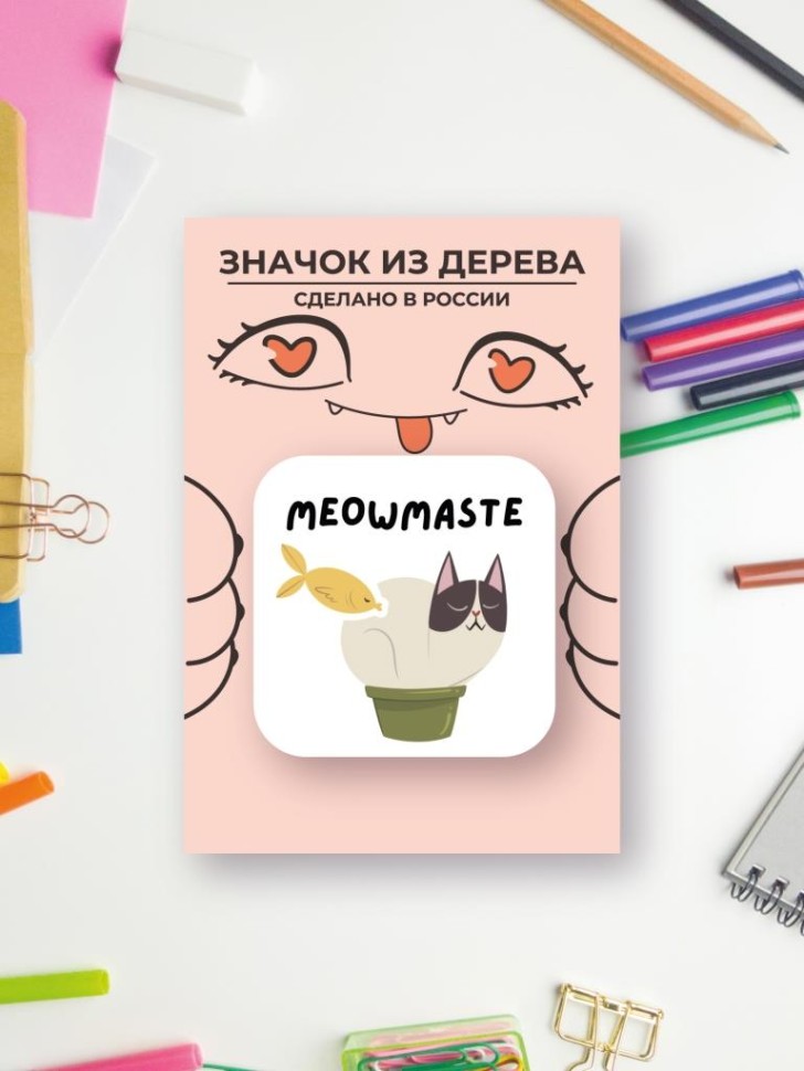 Значок выполнен из дерева с нанесением принта. На тыльной стороне застёжка в виде английской булавки. Каждый значок размещен на подложке и упакован в полиэтиленовый пакет с европодвесом.