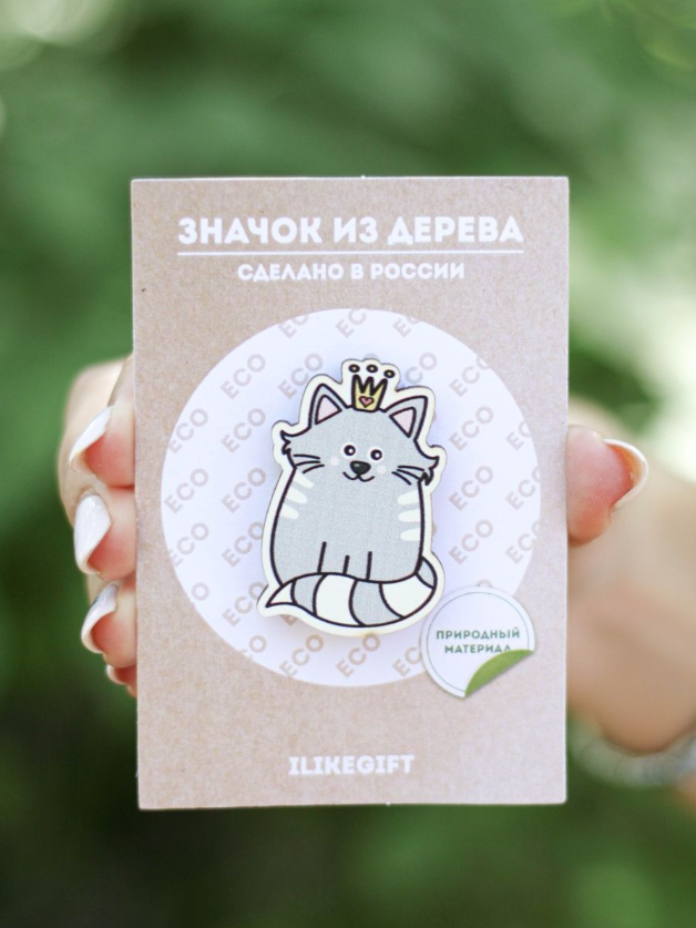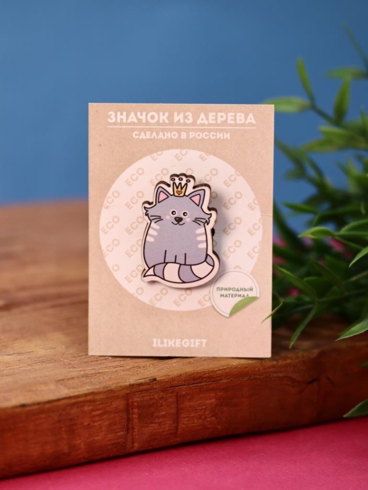 Значок выполнен из дерева с нанесением принта. На тыльной стороне застёжка в виде английской булавки. Каждый значок размещен на подложке и упакован в полиэтиленовый пакет с европодвесом.