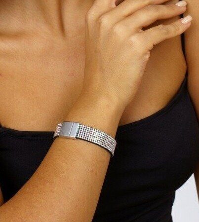 Описание Длина браслета: 19,5 см, ширина браслета: 2,2 см. Состав: текстиль, стразы. Замок с поворотным механизном. Вес: 15 гр.