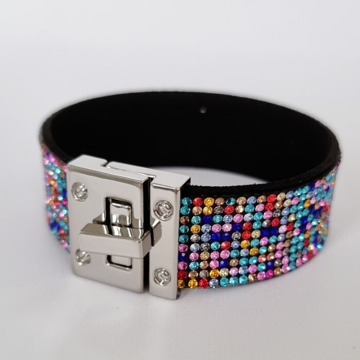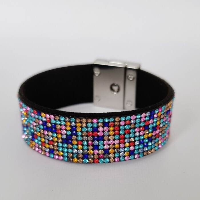 Браслет на руку со стразами, цвет ремешка: черный, цвет камней: разноцветные переливающиеся, арт.002.133