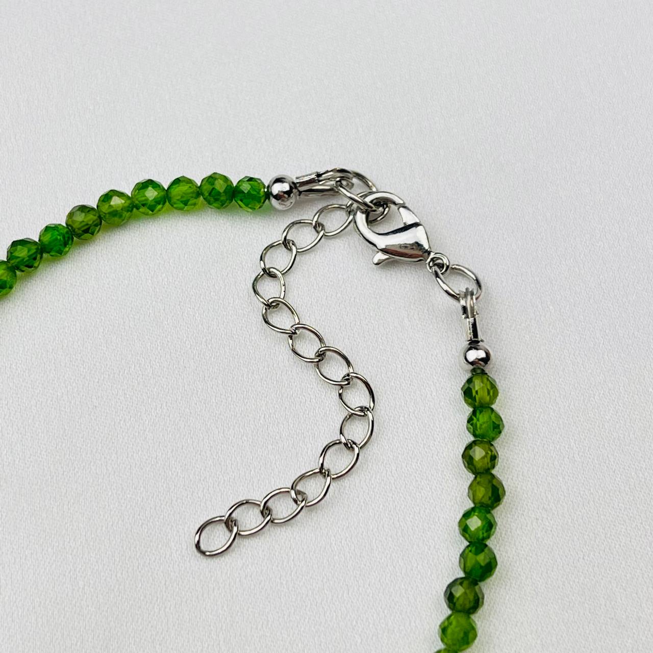 Цвет камня: Миксовый Месторождени..показатье: Россия Камень: Хромдиопсид Вставка: Жемчуг Диаметр: 2,5-3 мм Производитель: Радуга Самоцветов (Россия) Тип замка: Карабин с цепочкойе: Россия