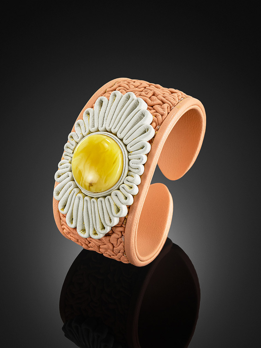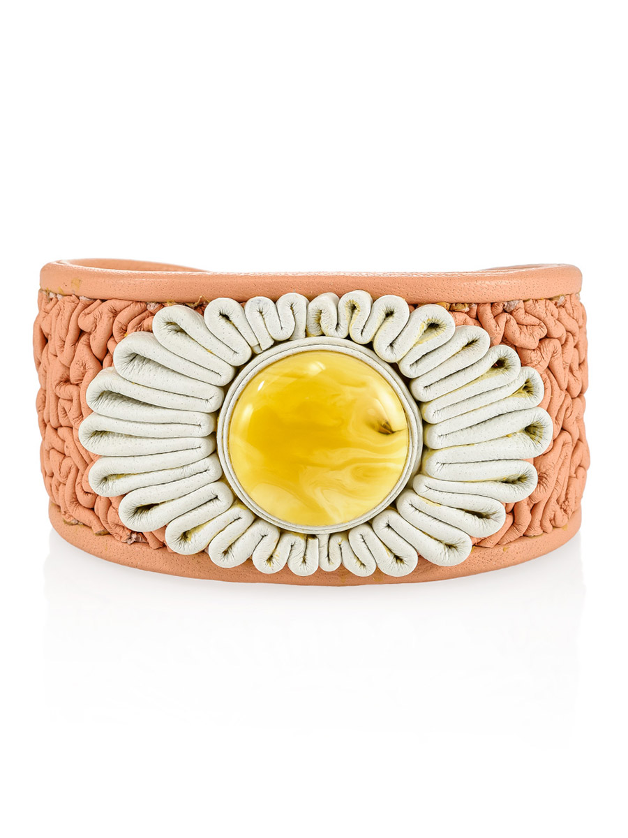 Браслет из кожи розового цвета с вставкой из медового янтаря «Нефертити»