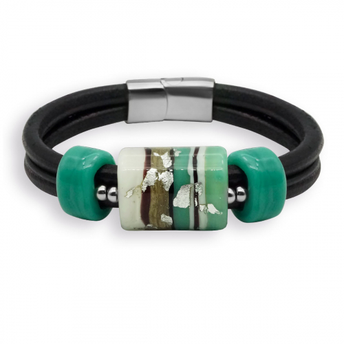 Браслет изготовлен из муранского стекла, натуральной кожи и гипоаллергенной ювелирной стали, что очень важно для людей с чувствительной кожей. Металл не темнеет и не подвергается воздействиям окружающей среды, надолго обеспечивая красивый внешний вид изделия. Крепкий магнитный замок надежно фиксируется на запястье. Ширина браслета - 0,5 см. Размер стеклянной бусины - 1,4*2,3 см. Диаметр стеклянных шариков - 1,2 см. Вес - 25 гр.