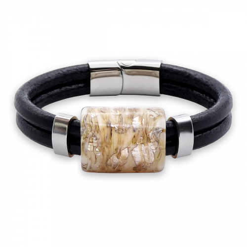 Браслет изготовлен из муранского стекла, натуральной кожи и гипоаллергенной ювелирной стали, что очень важно для людей с чувствительной кожей. Металл не темнеет и не подвергается воздействиям окружающей среды, надолго обеспечивая красивый внешний вид изделия. Крепкий магнитный замок надежно фиксируется на запястье. Ширина браслета - 0,5 см. Размер стеклянной бусины - 1,3x1,3 см. Вес - 13 гр.