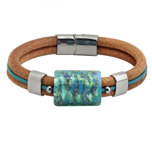 Браслет изготовлен из муранского стекла, натуральной кожи и гипоаллергенной ювелирной стали, что очень важно для людей с чувствительной кожей. Металл не темнеет и не подвергается воздействиям окружающей среды, надолго обеспечивая красивый внешний вид изделия. Крепкий магнитный замок с двойной защитой надежно фиксируется на запястье. Ширина браслета - 1,5 см. Размер стеклянной бусины - 1,9x2,5 см. Вес - 33 гр.