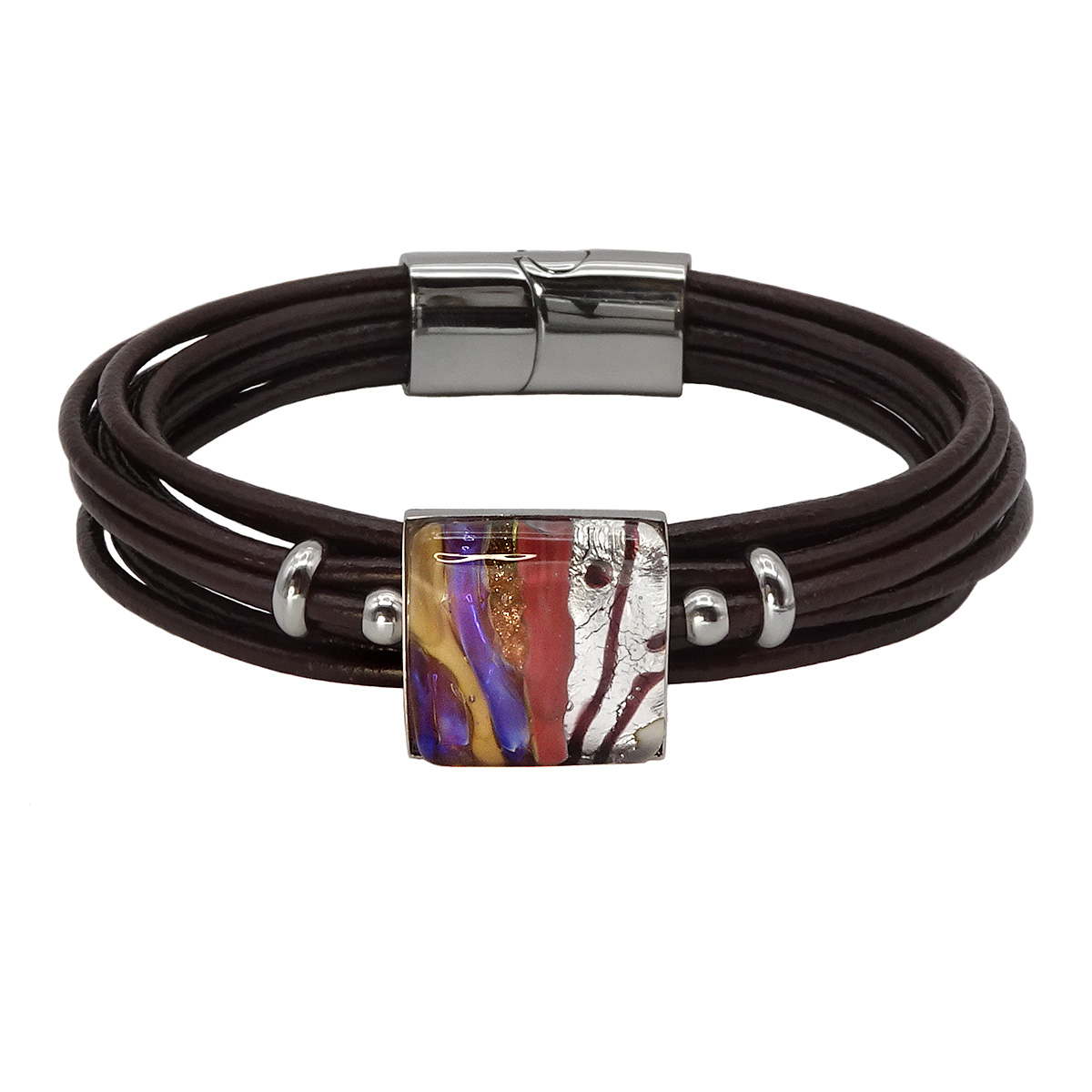 Браслет изготовлен из муранского стекла, натуральной кожи и гипоаллергенной ювелирной стали, что очень важно для людей с чувствительной кожей. Металл не темнеет и не подвергается воздействиям окружающей среды, надолго обеспечивая красивый внешний вид изделия. Крепкий магнитный замок с двойной защитой надежно фиксируется на запястье. Ширина браслета - 1,5 см. Размер стеклянного элемента - 1,6x1,6 см. Вес - 19  гр.