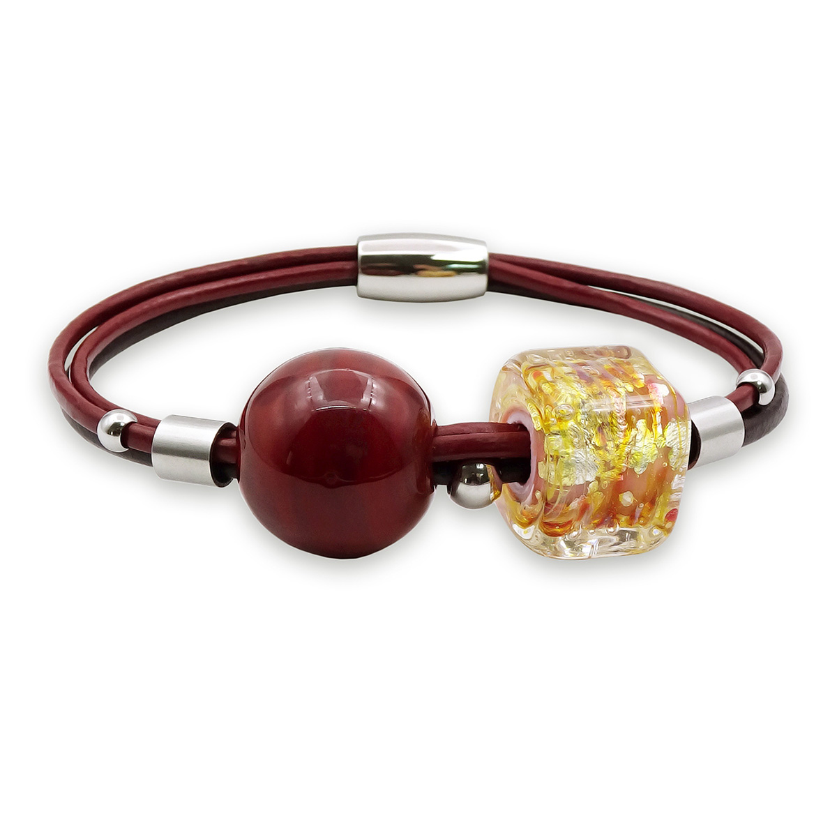 Браслет изготовлен из муранского стекла, натуральной кожи и гипоаллергенной ювелирной стали, что очень важно для людей с чувствительной кожей. Металл не темнеет и не подвергается воздействиям окружающей среды, надолго обеспечивая красивый внешний вид изделия. Крепкий магнитный замок надежно фиксируется на запястье. Ширина браслета - 0,5 см.  Размер стеклянных бусин - 1,5*1,5 и 1,5*1,5 см. Вес - 23 гр.