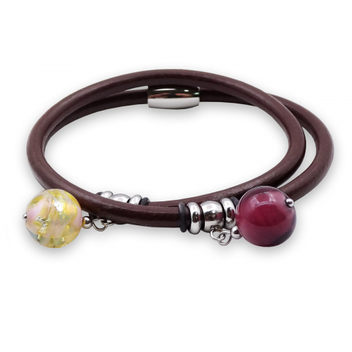 Браслет изготовлен из муранского стекла, натуральной кожи и гипоаллергенной ювелирной стали, что очень важно для людей с чувствительной кожей. Металл не темнеет и не подвергается воздействиям окружающей среды, надолго обеспечивая красивый внешний вид изделия. Крепкий магнитный замок надежно фиксируется на запястье. Ширина браслета - 1 см. Диаметр стеклянных шариков - 1,2 см.